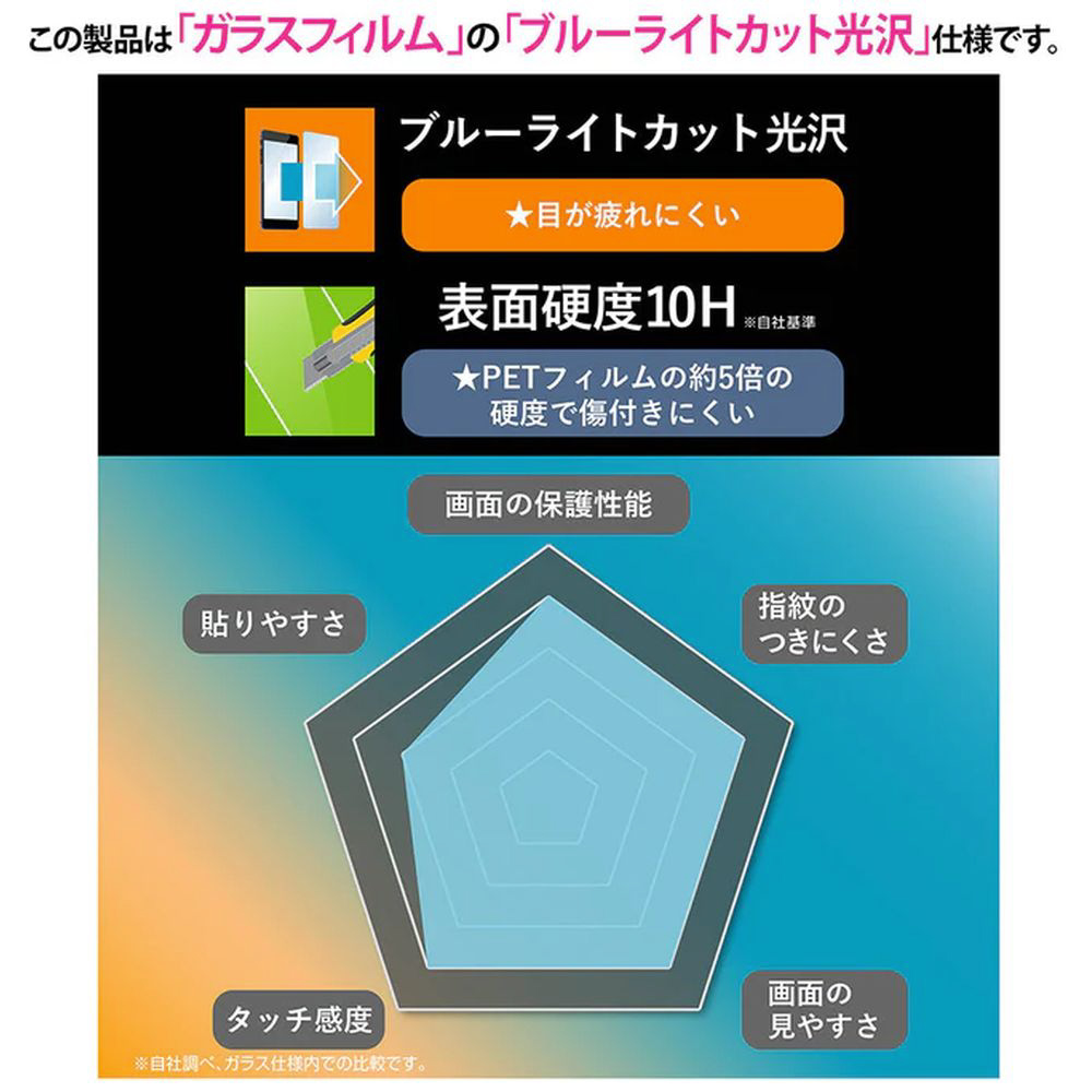 PETフィルムの約5倍の硬度で傷付きにくい。ブルーライトを約40%軽減、画面が綺麗に見える。防汚コーティングで指紋防止効果。レイ・アウト製ケース(別売)と一緒に使用しても干渉しない設計。