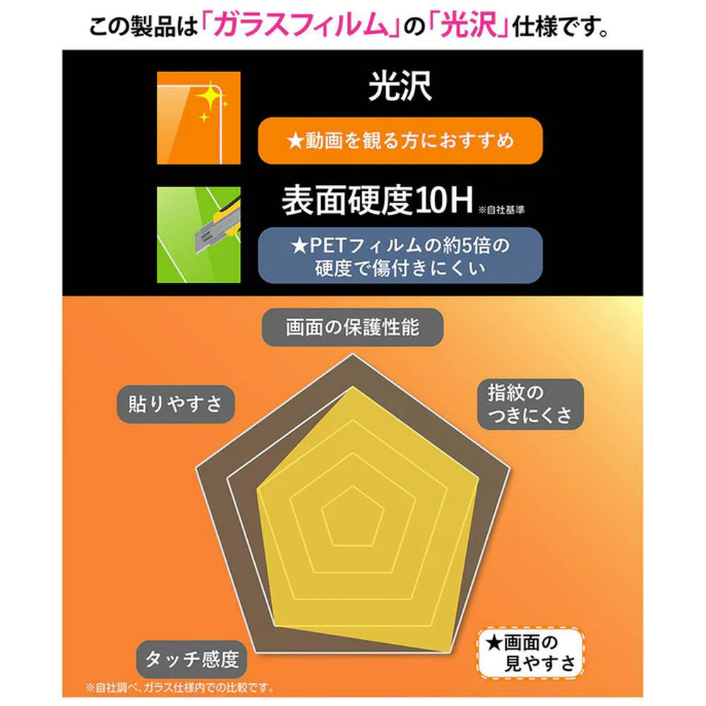 PETフィルムの約5倍の硬度で傷付きにくい。美しい光沢仕様で、高画質な写真や動画が綺麗に見える。防汚コーティングで指紋防止効果。レイ・アウト製ケース(別売)と一緒に使用しても干渉しない設計。