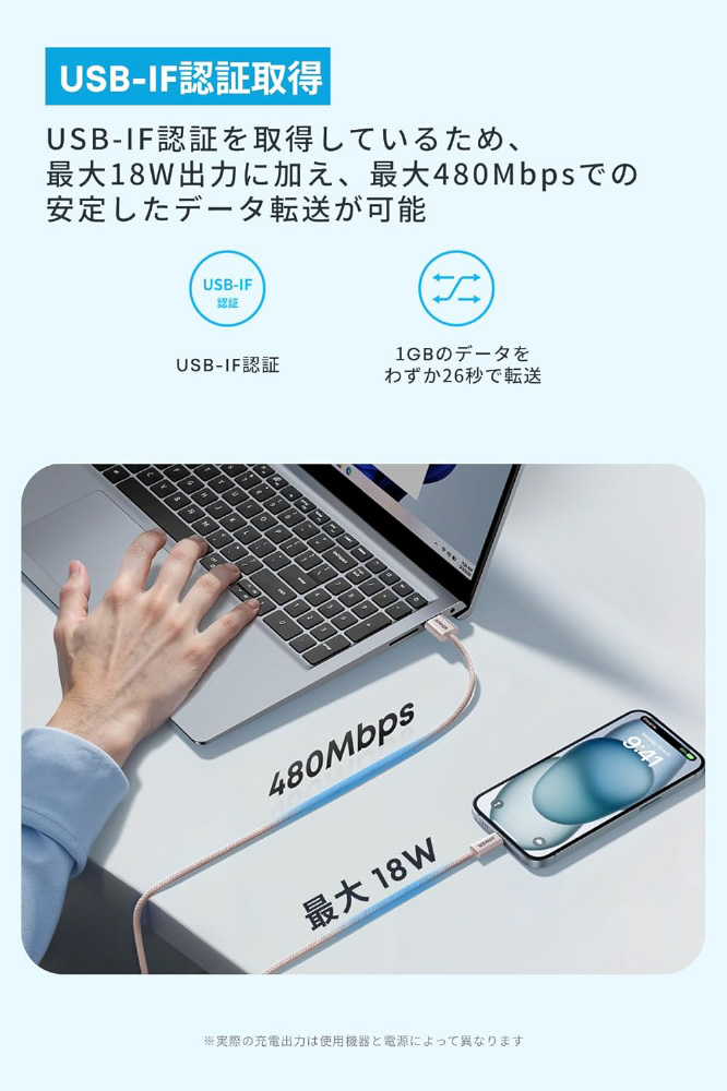 USB-IF認証を取得しているため、最大18W出力に加え、最大480Mbpsでの安定したデータ転送が可能
