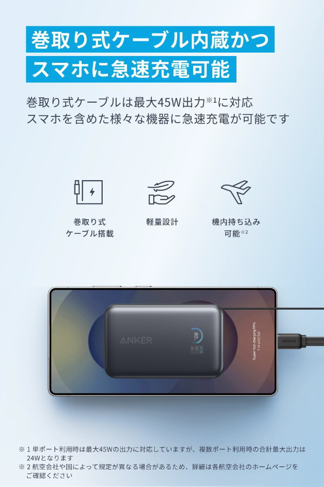 巻取り式ケーブルは最大45W出力に対応し、スマホを含めた様々な機器に急速充電が可能です。