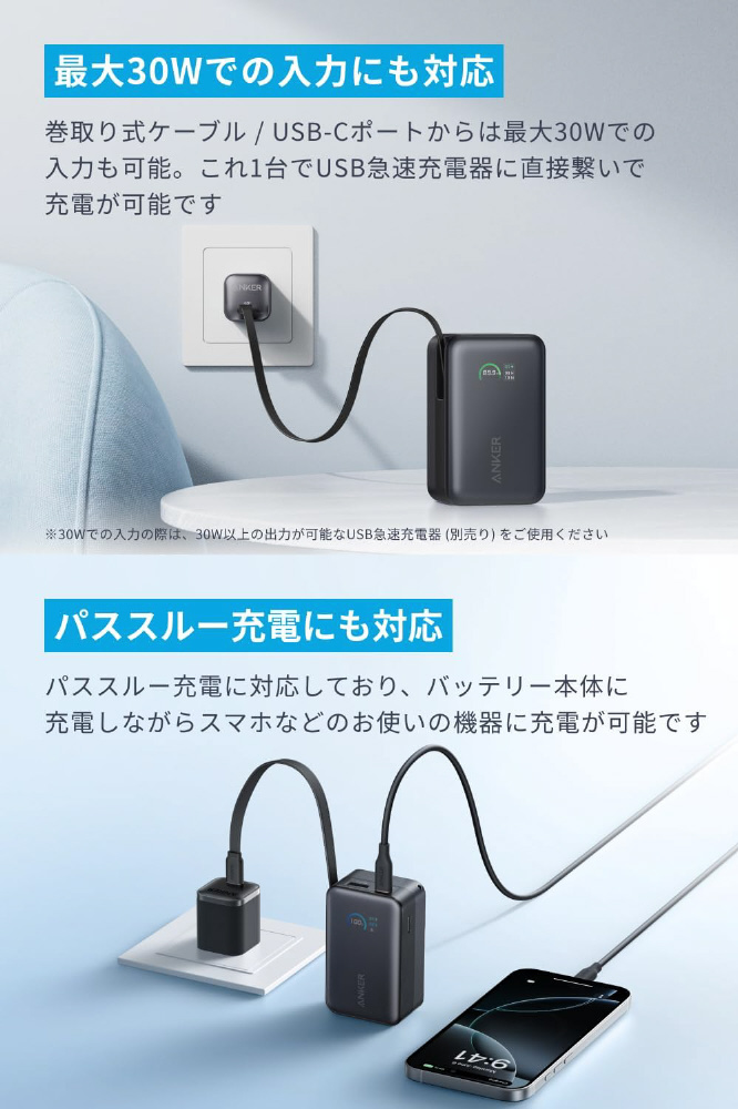 巻取り式ケーブル / USB-Cポートからは最大30Wでの入力も可能です。これ1台でUSB急速充電器に直接繋いで充電が可能です。