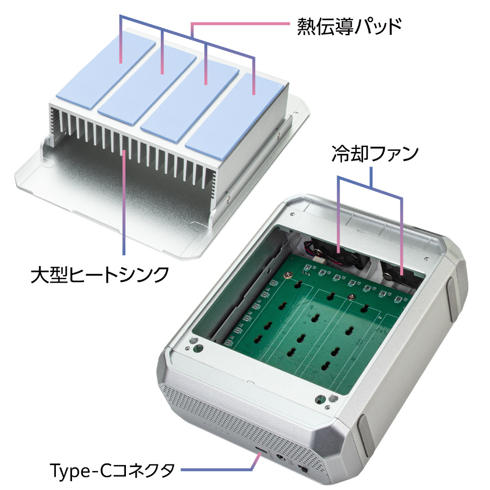 Macでも、Windowsでも、高速に。- USB 40Gbps接続M.2 NVMeが最大4枚搭載できるSSDケース
