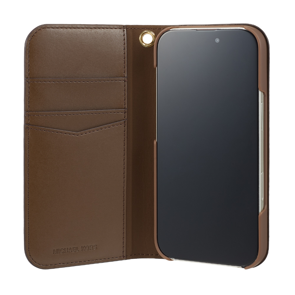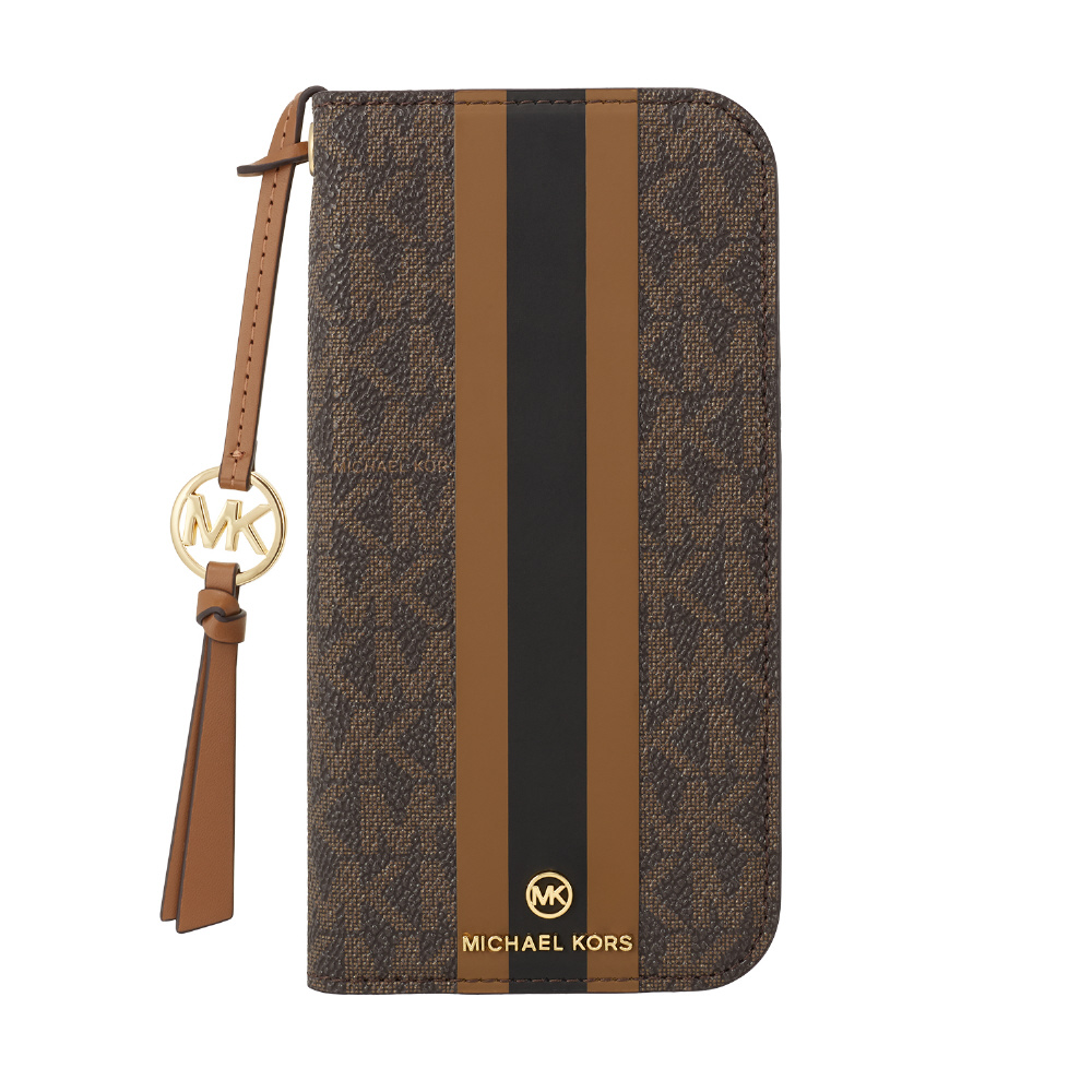 MKシグネチャーのロゴプリントキャンバスに、ストライプをあしらったデザインが特徴のブックタイプのスマホケースです。ブックタイプの為、大切な画面を衝撃や傷から守ります。
