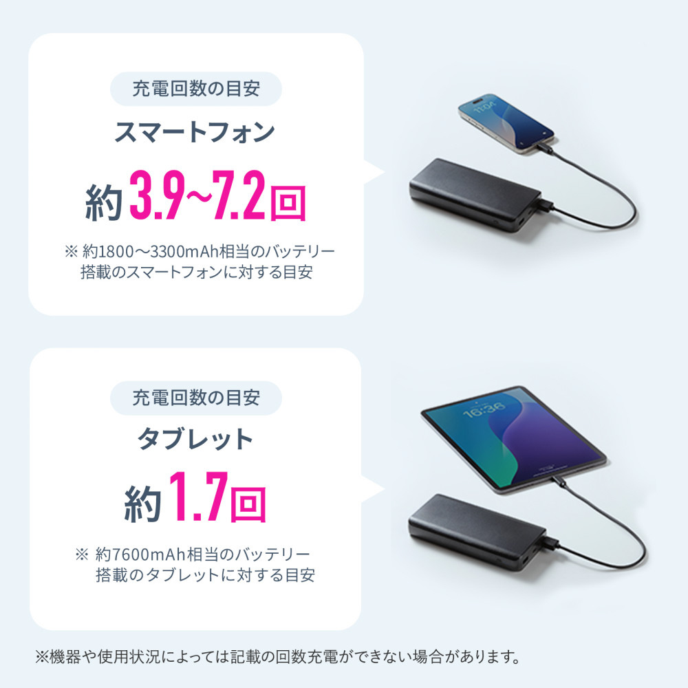 ●泊まりの外出でも安心な20000mAhの大容量で、スマートフォンもタブレットもたっぷり充電できるモバイルバッテリーです。