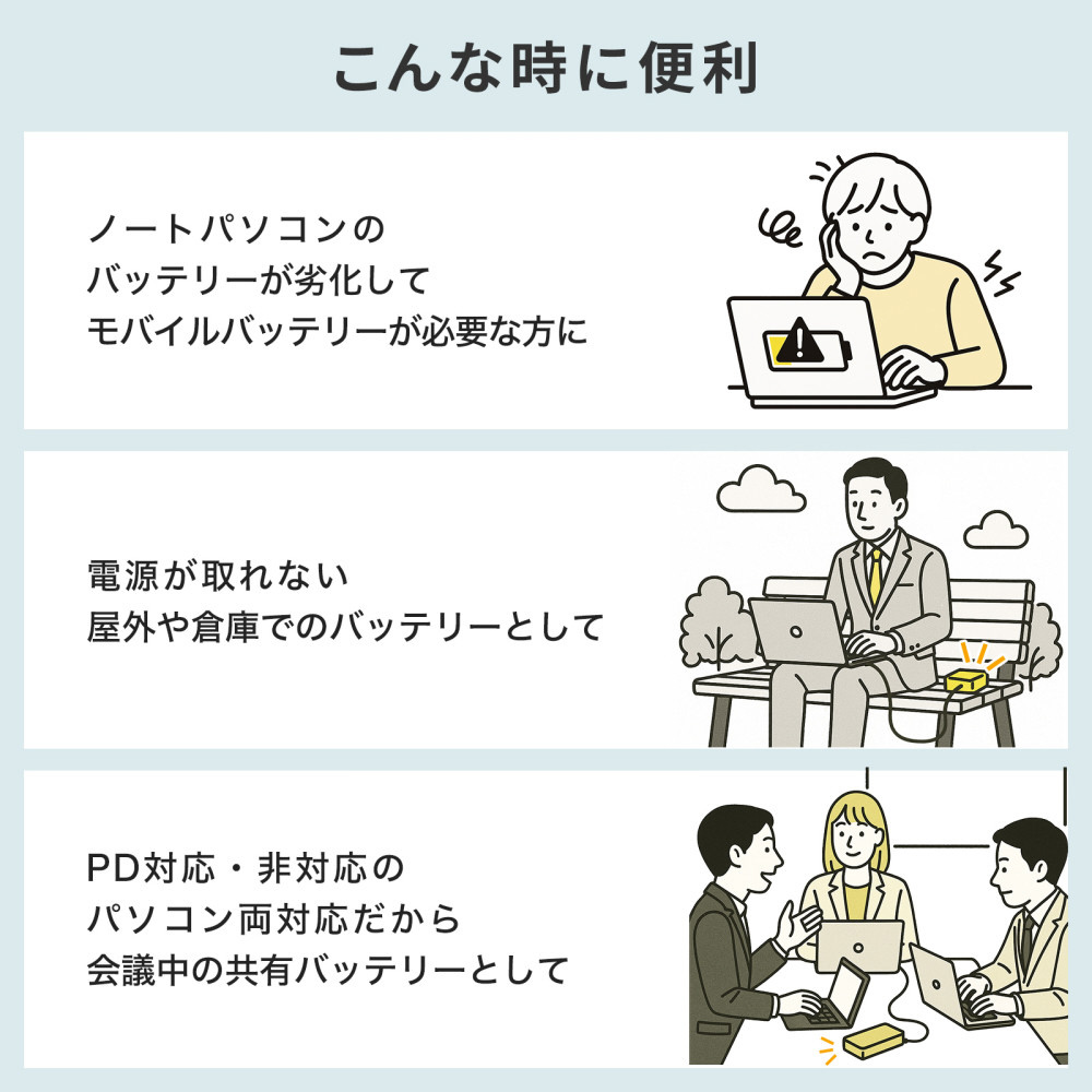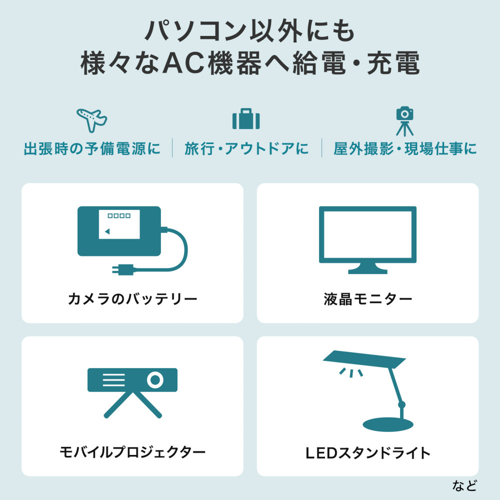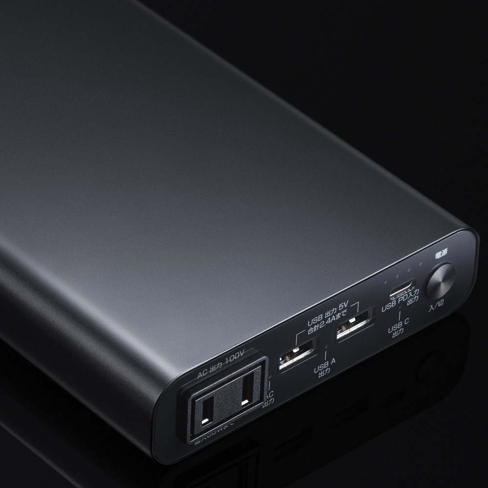 ノートパソコンへの給電に最適な、ACコンセントプラグを直接挿せるAC出力付きモバイルバッテリー。USB PD給電にも対応。
