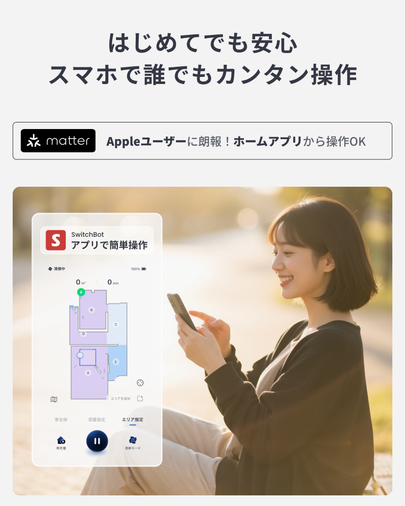 ・AIカメラと距離センサーを搭載し、人の目のように精緻にマッピングと障害物回避を行いスマートなお掃除体験を。