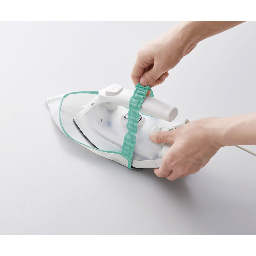 (2)本品の先端とアイロンの先端を合わせ、ハンドルにゴムをかけます。