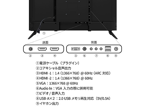 32インチのVAパネルを搭載、FWXGA(1366x768)解像度に対応した液晶モニターです。