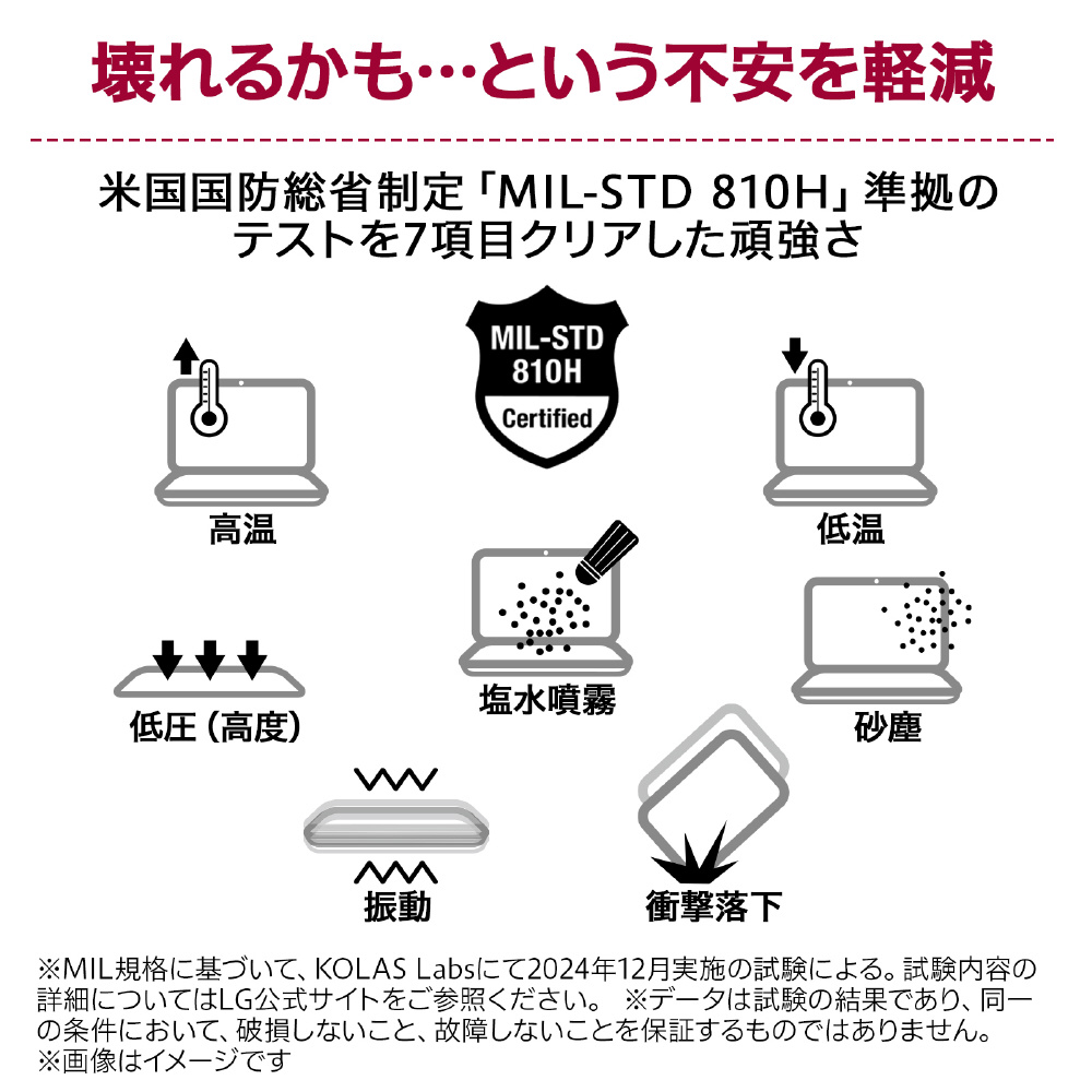 * MIL規格に基づいて、KOLAS Labsにて2024年12月実施の試験による。 衝撃・落下テスト:[衝撃]衝撃波形20G 11msecを6方向各3回 計18回 [運送時落下]高さ1220mmから26回(梱包時/床材質:鉄板)/振動テスト:5〜500Hzを3方向各1時間 計3時間/高温テスト:[動作時]32℃〜49℃で72時間 [保管時]33℃〜71℃で168時間/低温テスト:[動作時]-21℃で24時間 [保管時]-25℃で24時間/低圧(高度)テスト:[動作時、保管時] 高度4,572mで1時間/砂塵テスト:砂塵を風速8.9m/sで12時間/塩水噴霧テスト:塩水噴霧24時間、乾燥24時間実施後腐食検査 2回