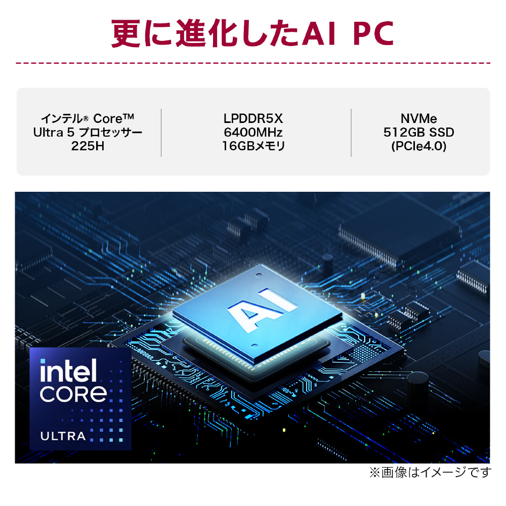 グラフィック性能とマルチタスクの処理に強みをもつインテル Core Ultra 5 プロセッサー 225Hを搭載。LPDDR5X 6400MHz 16GBメモリ、NVMe SSD(512GB)との組み合わせで、マルチタスクも快適にこなせるパフォーマンスを発揮します。