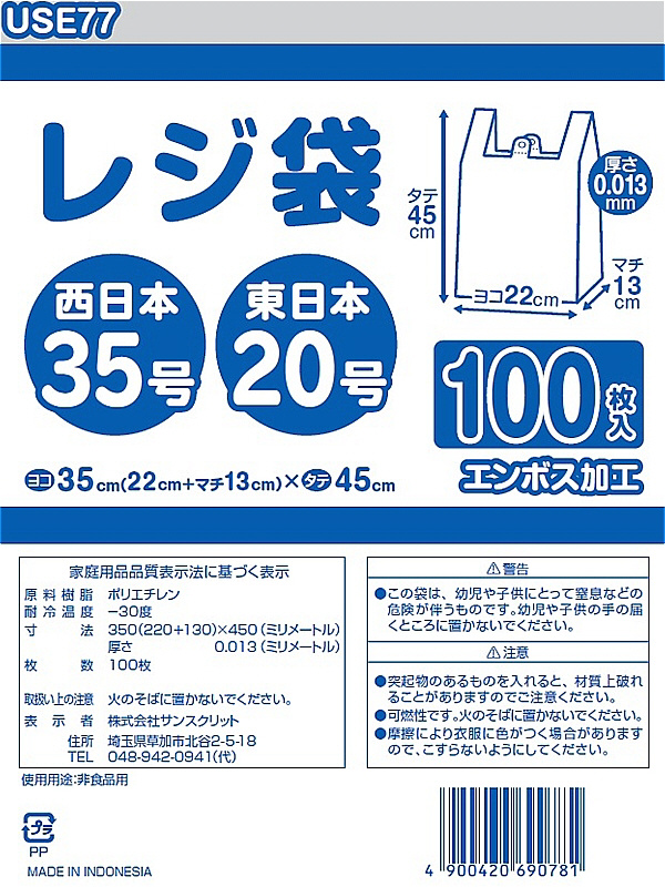 エンボス加工タイプのレジ袋です。※取扱上の注意、火のそばには置かないで下さい。