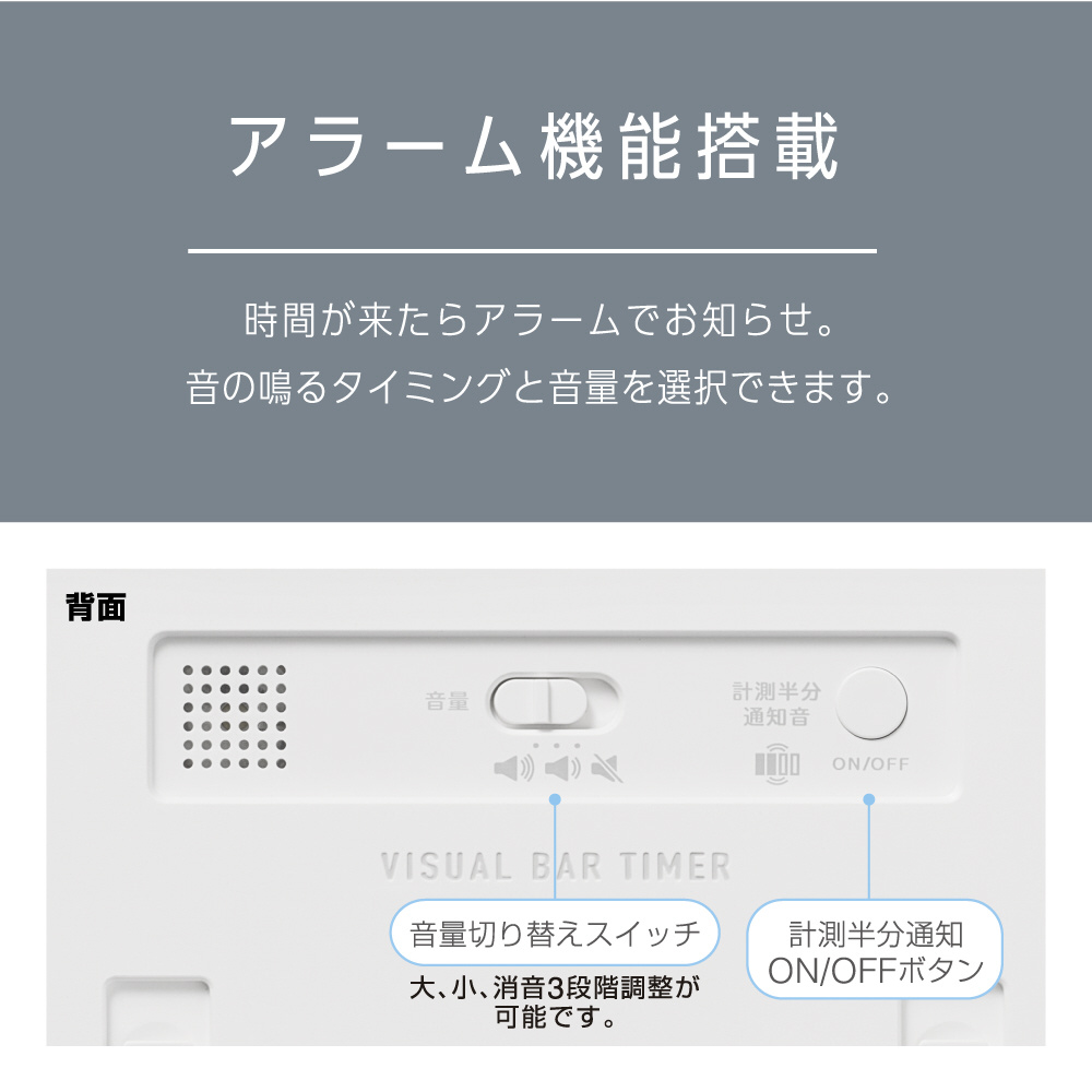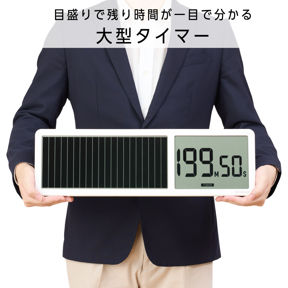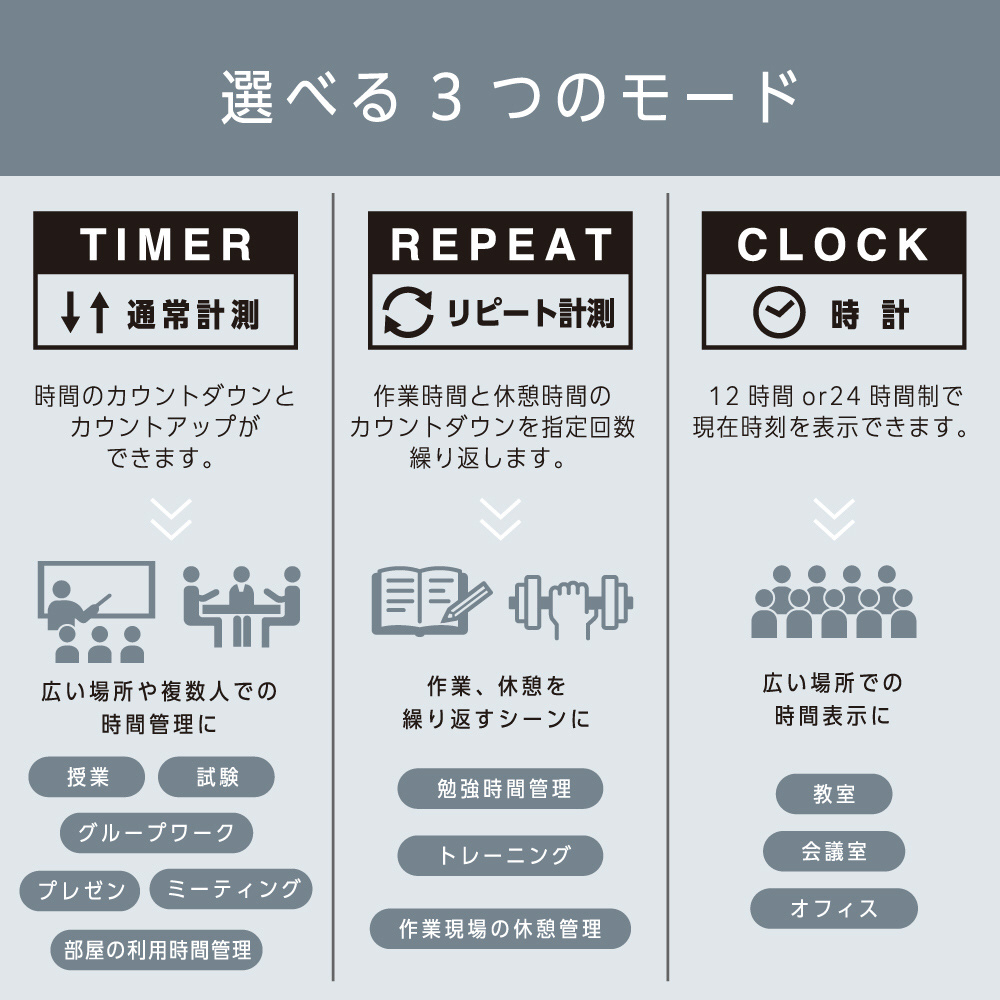 バーの目盛りで残り時間が一目で分かる大型タイマーです。通常計測モードとリピート計測モード、時計モードの選べる3つのモードを搭載。大型サイズで視認性が良いため、学校や試験会場、オフィスの会議室などの広い場所での使用に最適です。
