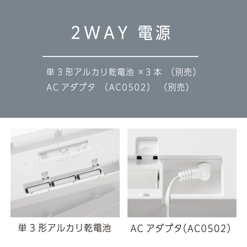 アラーム音は大、小、消音の3段階に切り替え可能。計測時間が半分になると音で知らせる「計測半分通知」機能搭載(ON/OFF可能)。電源は単3形アルカリ乾電池×3本(別売)またはACアダプタ(AC0502/別売)の2種類から選べます。