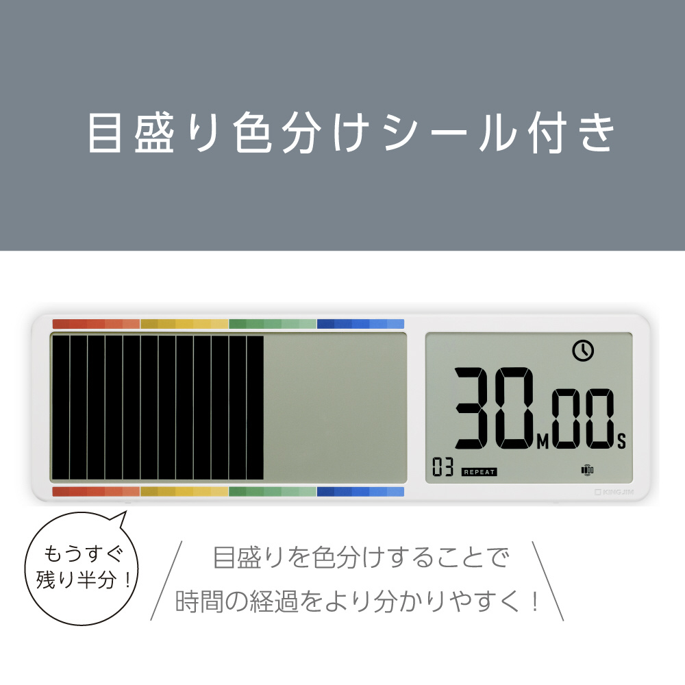目盛り液晶の上下に貼ることができる「目盛り色分けシール」を同梱しています。赤・黄・緑・青の4色で目盛りを大まかに4分割することによって、遠くからでも目盛りが全体の何分の一程度経過したかがよりわかりやすくなります。
