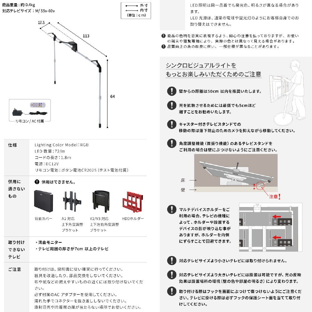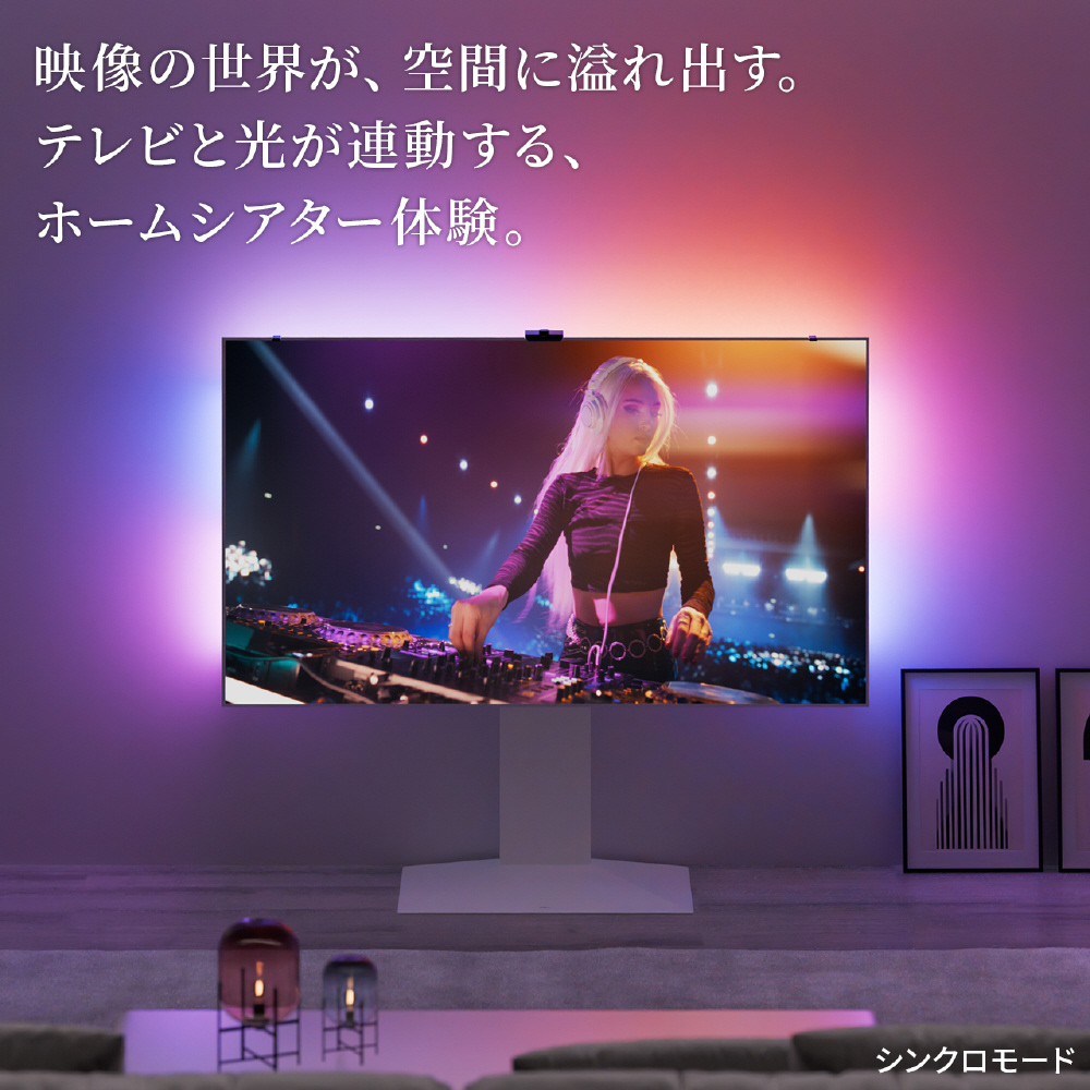 映画・ライブ・ゲーム・スポーツの映像にシンクロし同調した光がお部屋に広がる拡張型LEDライト。使用することでより映像に没入できる空間に変わります。テレビ背面に掛けるだけで簡単に設置可能。55〜60インチテレビ対応。