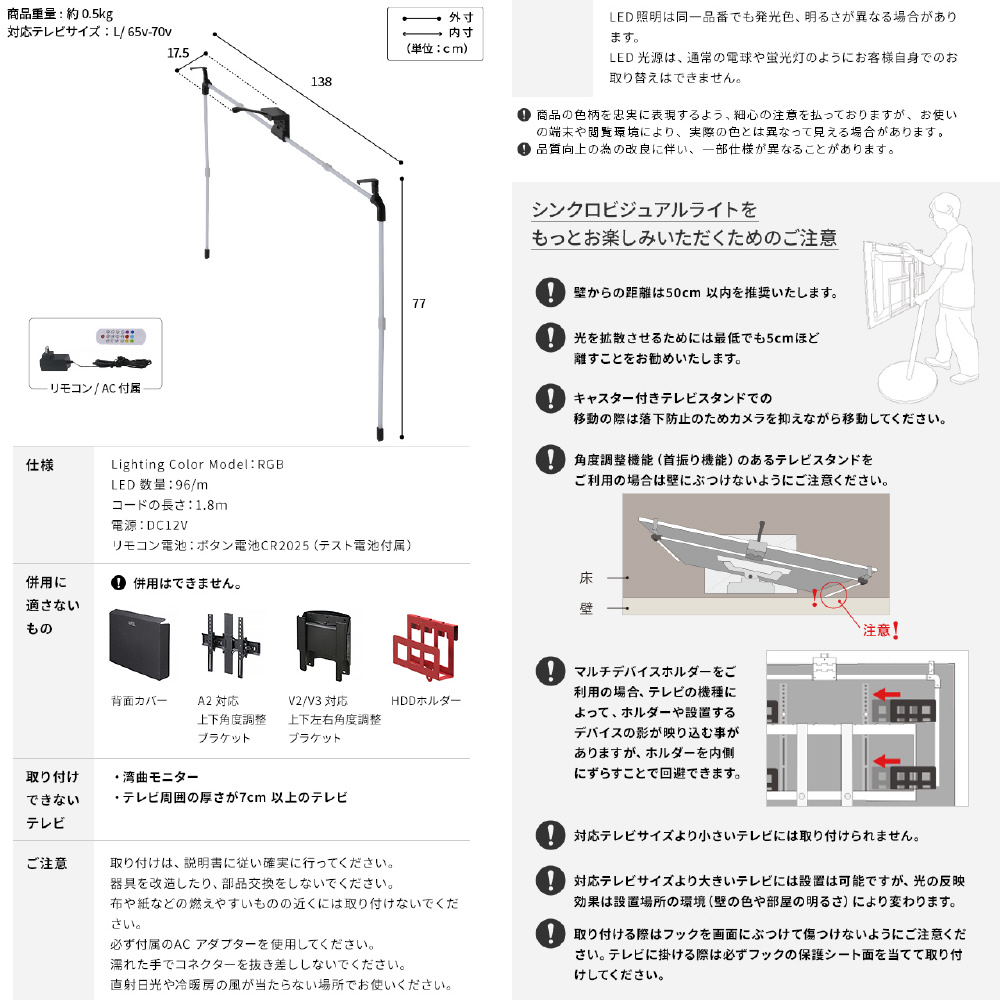 映画・ライブ・ゲーム・スポーツの映像にシンクロし同調した光がお部屋に広がる拡張型LEDライト。使用することでより映像に没入できる空間に変わります。テレビ背面に掛けるだけで簡単に設置可能。65〜70インチテレビ対応。