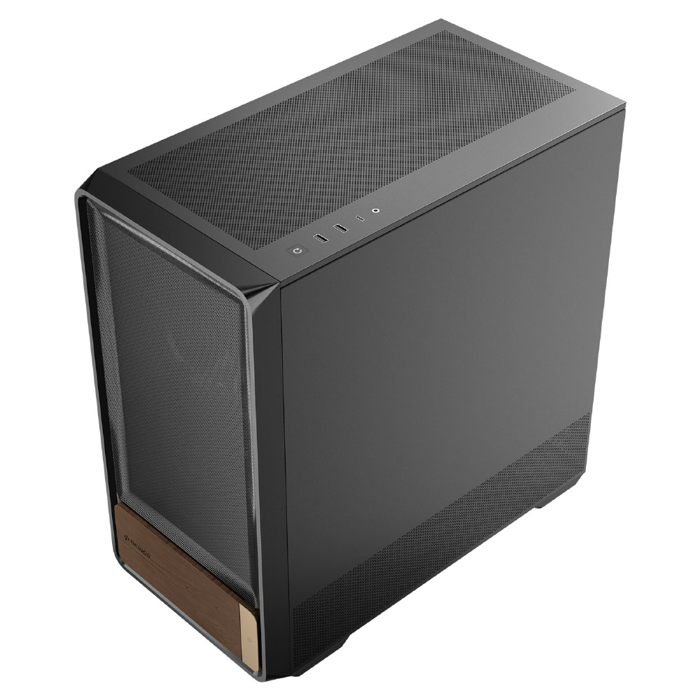 Air Crossは、ケースボトムとフロントから強力な吸気を行うデュアルエアフロー設計のPCケースです。ケースフロント下部には本物のウォルナット材を使い、落ち着いた温かみのある外観に仕上がっています。電源を90°横向きにし、フロントパネル裏側に配置する独自の設計を採用することでケース底面の吸気を最大化し、GPUを強力に冷却します。