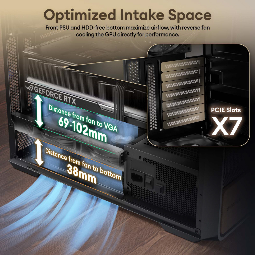電源ユニットを90°横向きかつフロント側に配置し、さらにHDDやSSDなどのストレージ搭載スペースも移動させることで、ケースボトムからGPUまでの遮蔽物を無くし、標準搭載された120 mmリバースファン2基がダイレクトにGPUを冷却します。