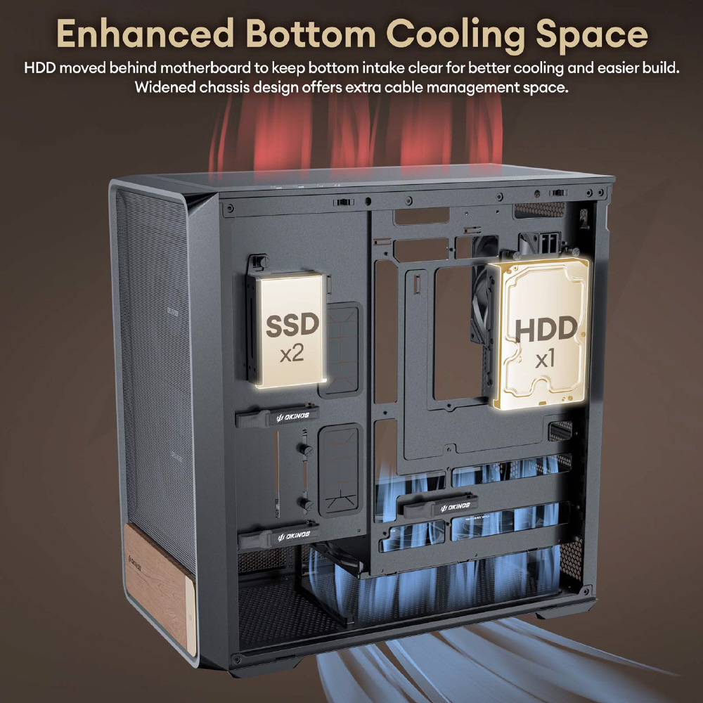 Air Crossは、ケースボトムとフロントから強力な吸気を行うデュアルエアフロー設計のPCケースです。ケースフロント下部には本物のウォルナット材を使い、落ち着いた温かみのある外観に仕上がっています。電源を90°横向きにし、フロントパネル裏側に配置する独自の設計を採用することでケース底面の吸気を最大化し、GPUを強力に冷却します。通常ボトムに配置するストレージスペースもマザーボードトレイ裏側に配置する一方、横幅を拡張することで余裕のある配線スペースを確保しています。