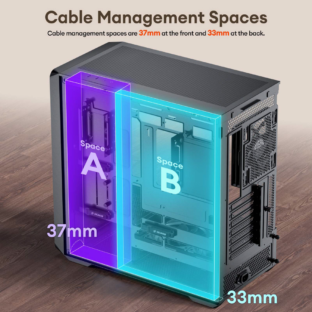 横幅に余裕のある設計で、ケース前方は最大37 mm厚、ケース後方は最大33 mm厚の裏配線スペースを確保しています。