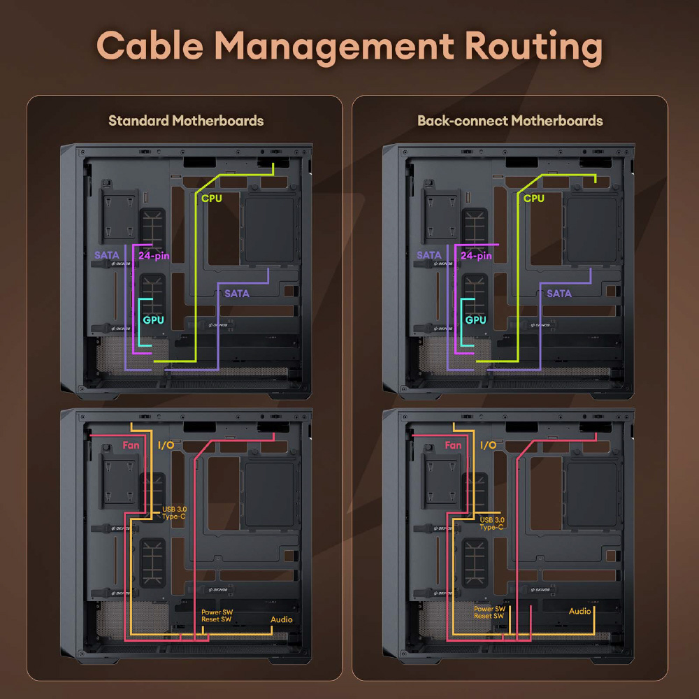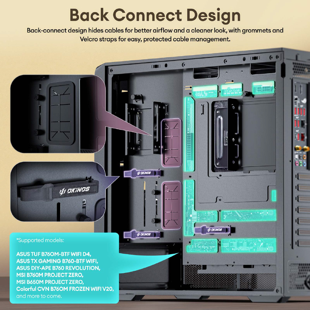 各社の裏配線マザーボードに対応し、ほとんど全ての配線をケース裏側に集約することが可能です。ケーブルマネジメントに便利なケーブルタイも各所に付属しています。