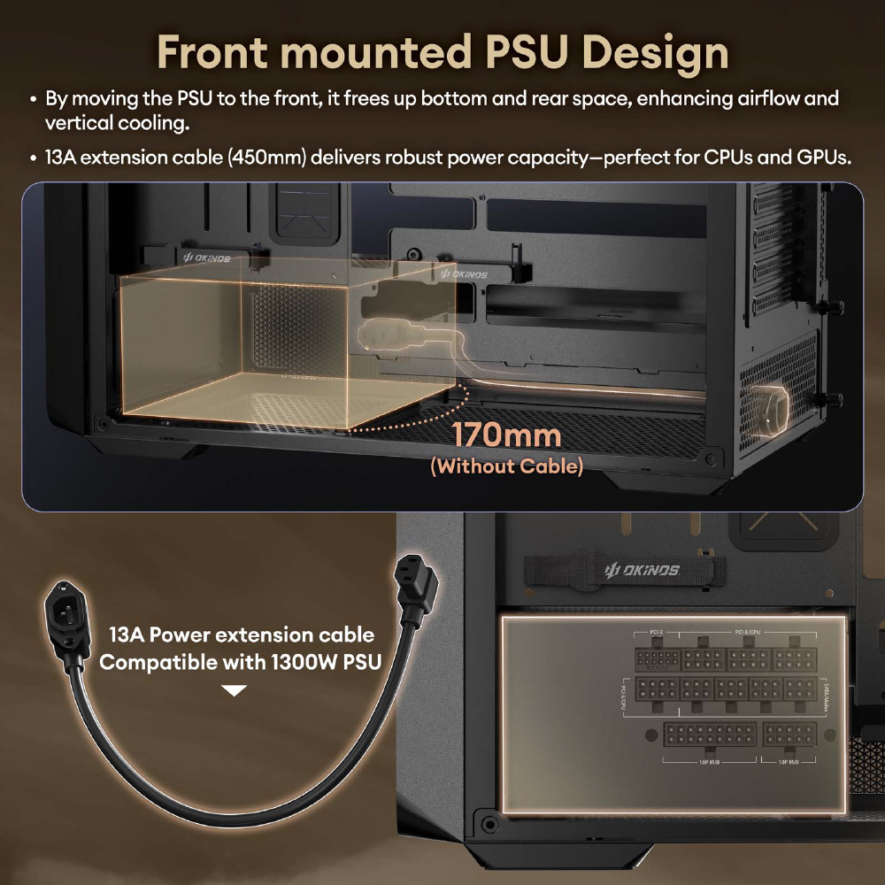 電源ユニットをケース後方から前方へと移動し、更に90°横向きに配置することでGPUへの吸気を妨げず、さらに電源ケーブルを直接裏配線スペースに誘導できるよう設計されています。電源本体の奥行きは最大で170 mm(ケーブル含まず)まで対応します。