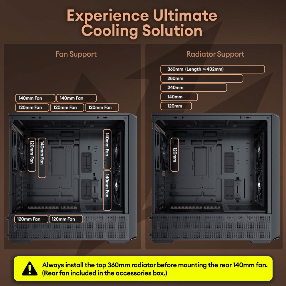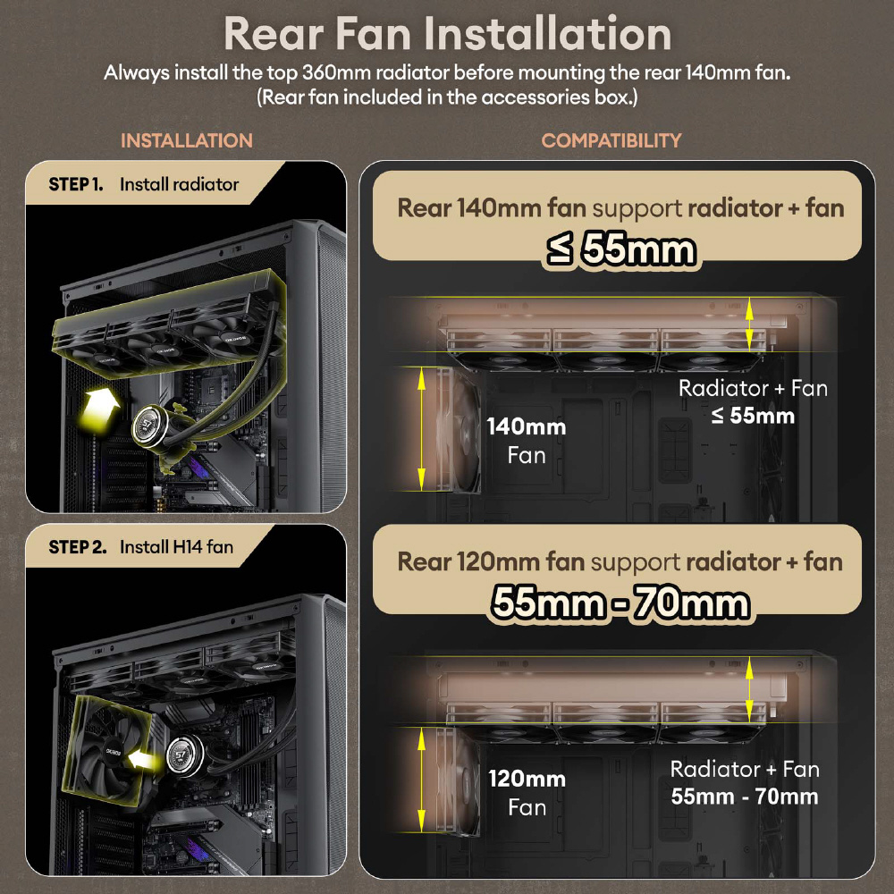 ※ケーストップに360 mmラジエータを搭載する場合、ラジエータを搭載してからリアファンを最後に装着してください