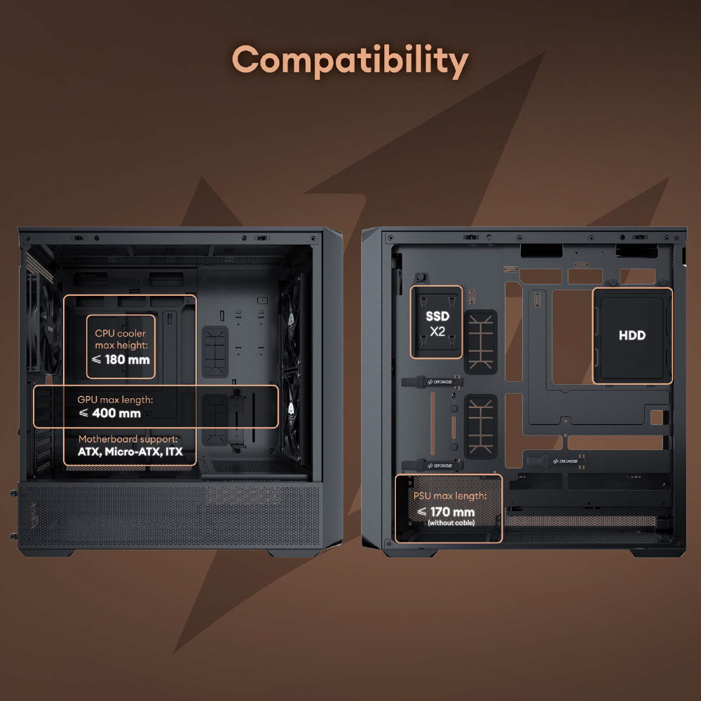 最大180 mmまでの空冷CPUクーラーに対応するほか、360 mmラジエータや170 mmまでの電源ユニットなど余裕を持って搭載することができます。