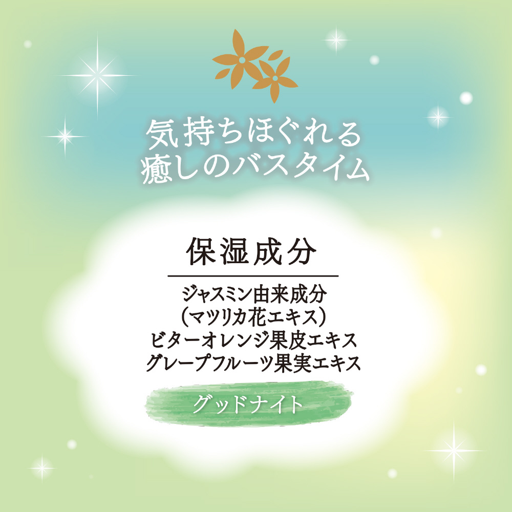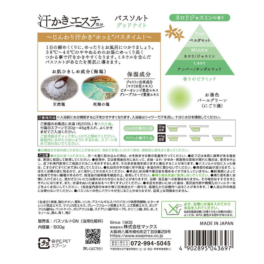 ●お湯につかって、じんわり汗かき●お肌ひきしめ成分(海塩)配合のバスソルト●気持ちほぐれるネロリジャスミンの香り●お湯色は白濁したパールグリーン(にごり湯)●夜間保湿成分として「ナイトモイスチャー: アスペルギルス/ウワバミソウ珠芽発酵物」配合で入浴後もお肌しっとり●500gのボックスタイプ