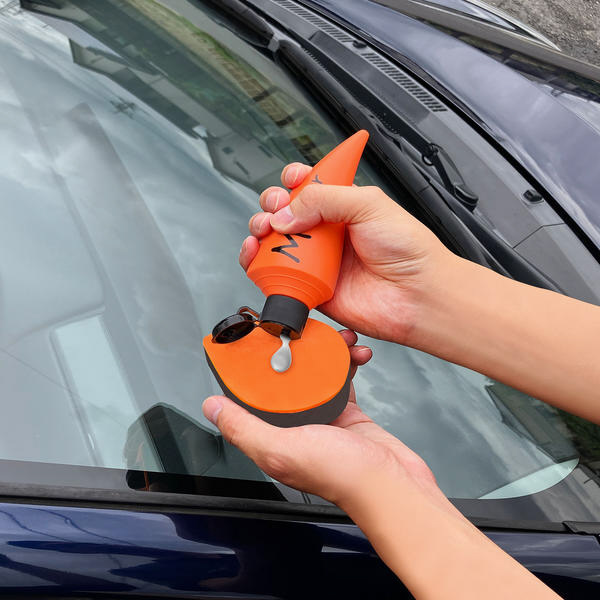 ティアドロップパッドに少し水を含ませ、オレンジ色面に本液を付けガラスに押し当て力を入れず擦ります。