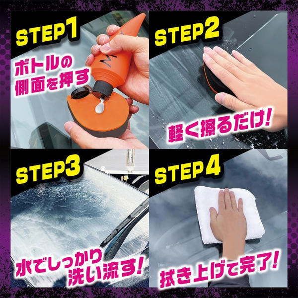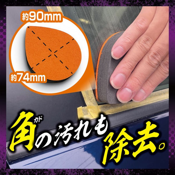 付属のティアドロップパッドと特殊研磨剤による相乗効果によって、フロントガラスの広い面や磨きにくい角の汚れも時間を掛けず徹底的に除去します。