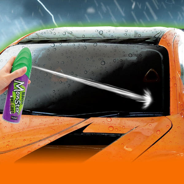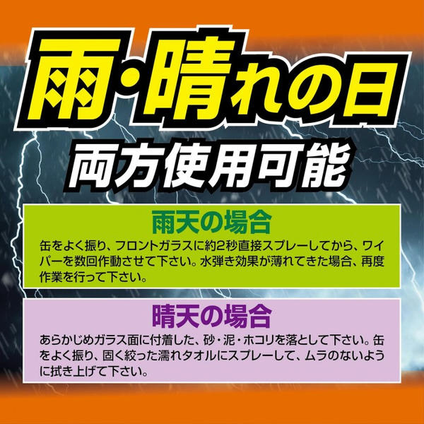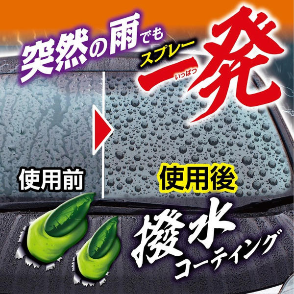 突然の雨でも、一発約2秒噴射してワイパーするだけで雨粒を弾く窓ガラス用撥水スプレーです。