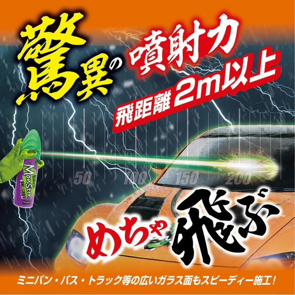 驚異の噴射力! 飛距離2m以上で、豪雨時でも窓ガラスに届き瞬時に撥水。またミニバンやトラック等の広いガラスでも、驚く程簡単に施工できスピーディーに仕上がります。
