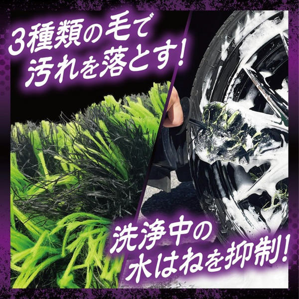 2.柔らかい3種類の毛が洗浄中の水はねを抑制し、衣類やボディーへの付着を抑えます。