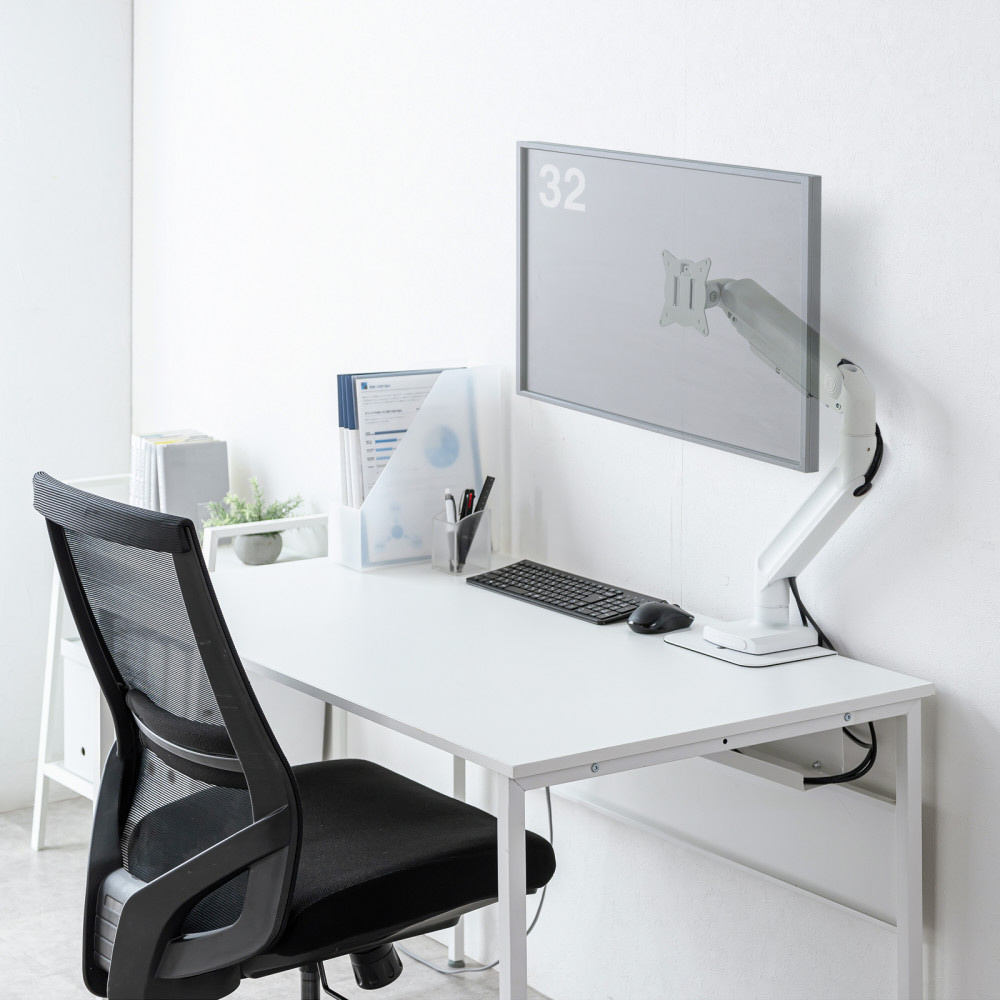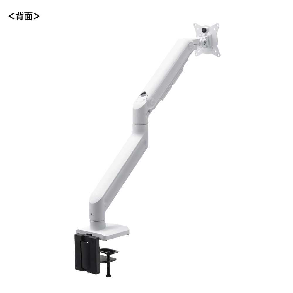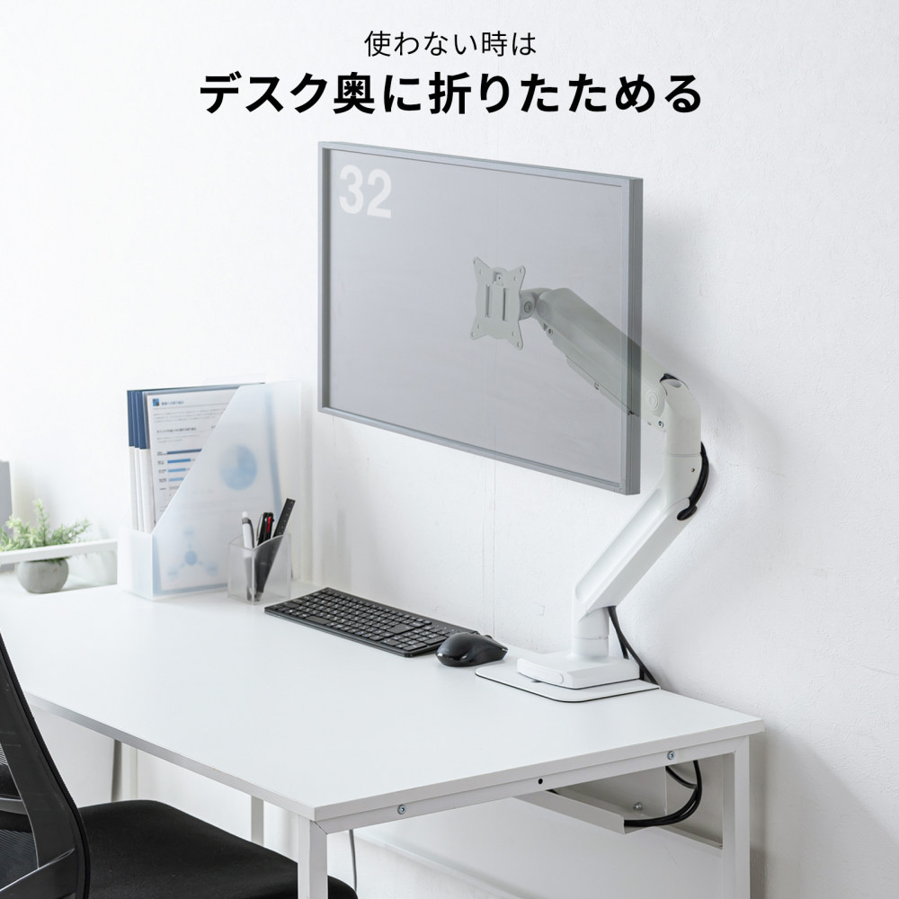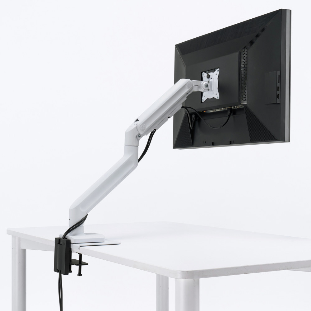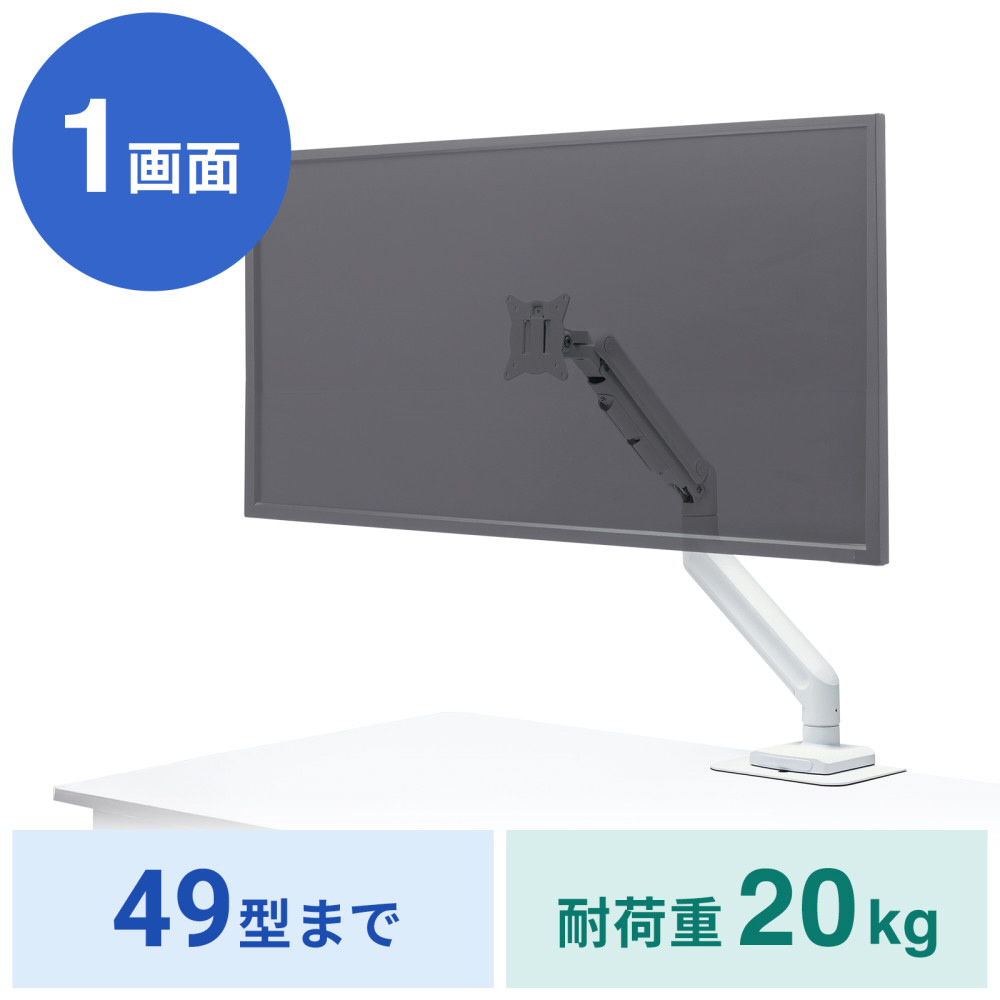 モニターの位置を自由に調整でき、耐荷重20kgで32〜49インチサイズのモニターに対応するガススプリング式のシングルモニターアーム。