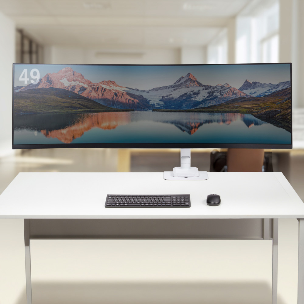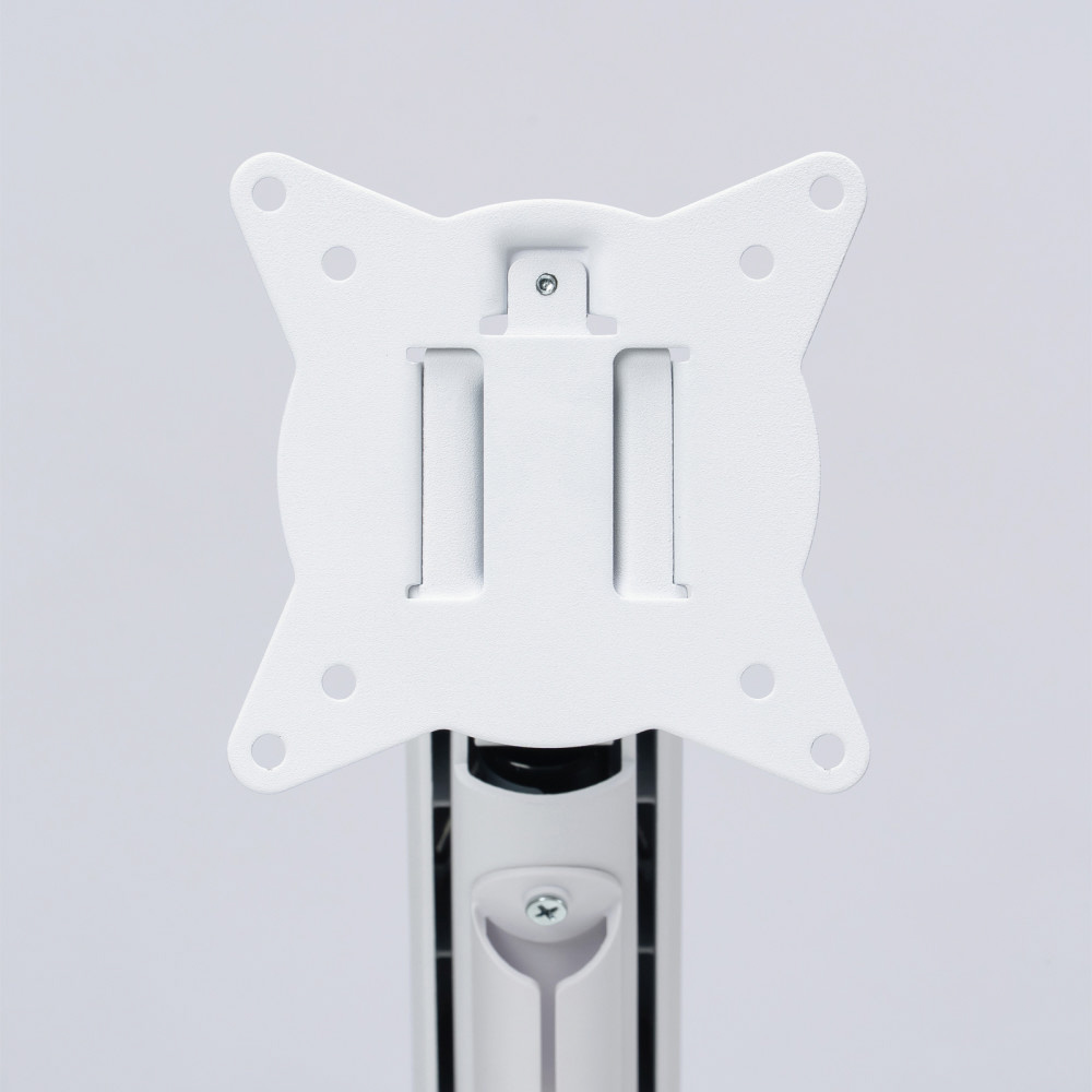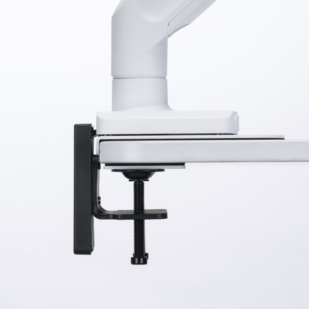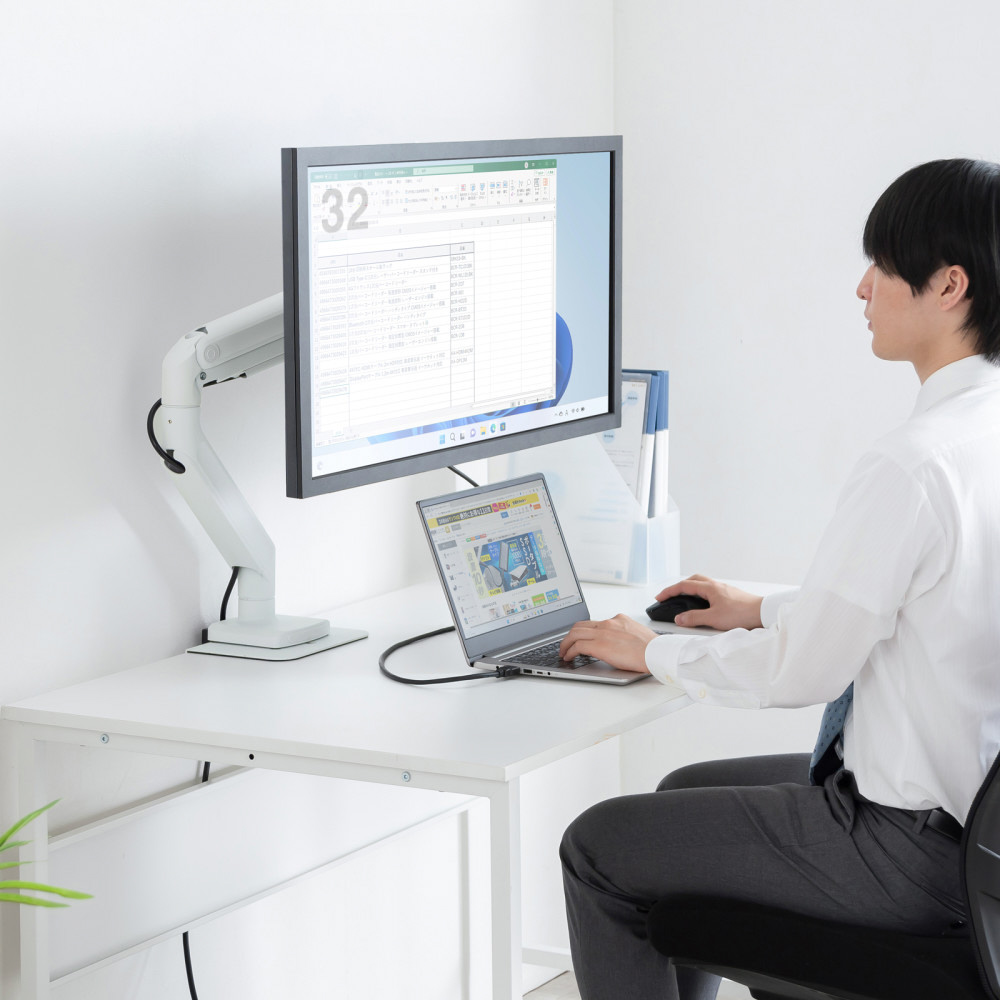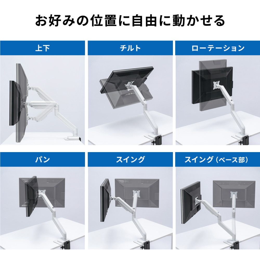 モニターの位置を自由に調整でき、耐荷重20kgで32〜49インチサイズのモニターに対応するガススプリング式のシングルモニターアーム。