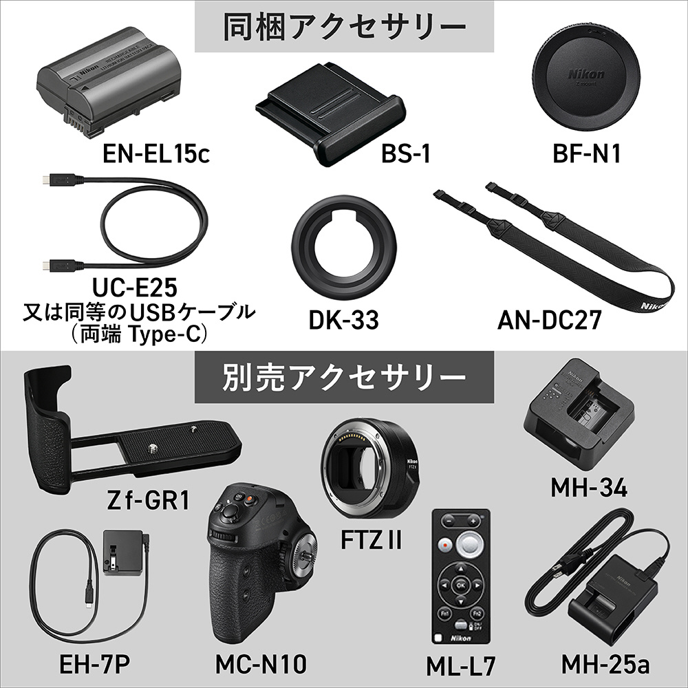 Li-ion リチャージャブルバッテリーEN-EL15c 、ストラップAN-DC27 、USB ケーブル、アクセサリーシューカバーBS?1、接眼目当てDK-33、ボディーキャップBF-N1
