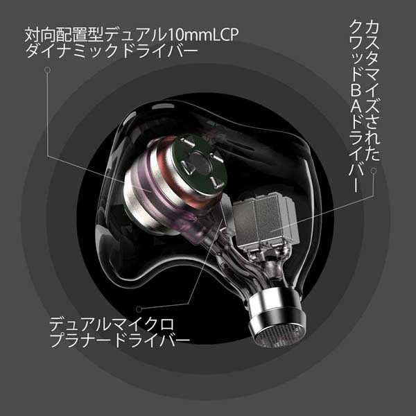 対向配置型10mm LCP(液晶ポリマー)ダイナミックドライバー2基、カスタマイズBAドライバーユニット4基、マイクロプラナードライバー2基の合計8基のドライバーを備える、フラッグシップクラスにも迫る堂々たる内部構成を採用したイヤホン