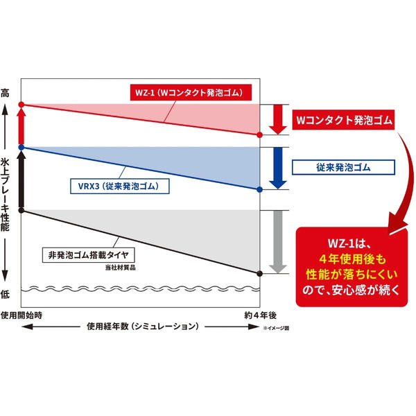 VRX3に比べWZ-1はタイヤのやわらかさに寄与するロングステイブルポリマーの配合量を増やすことで、経年による性能低下を抑制。