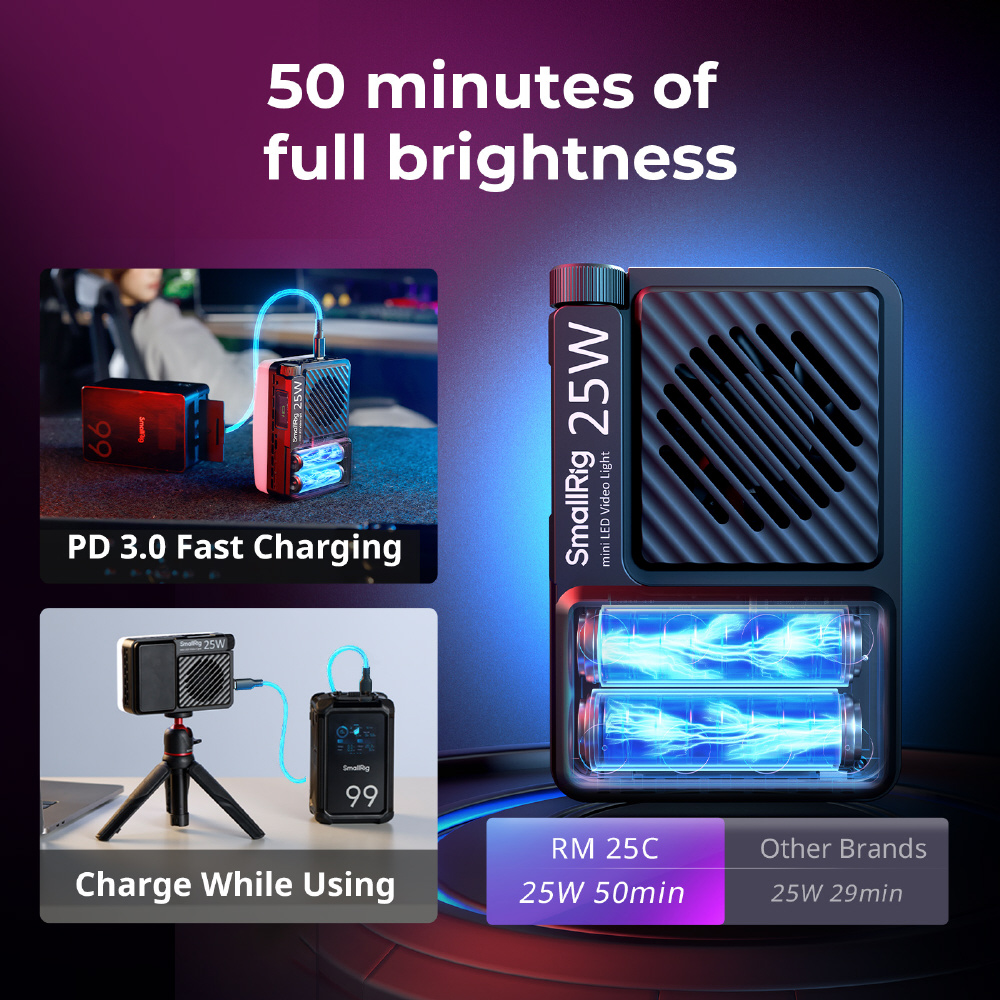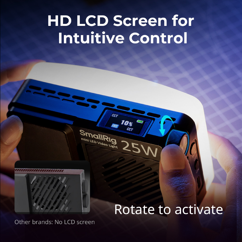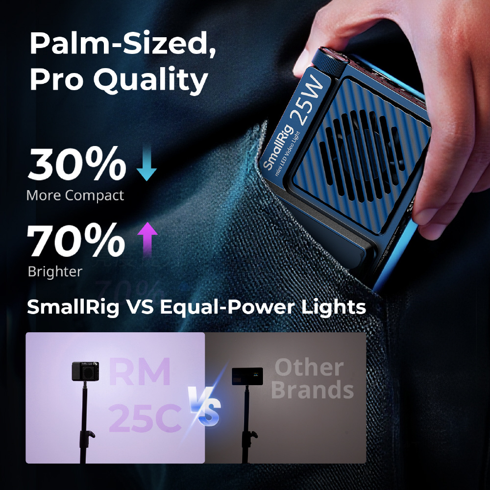 ・ コンパクトながらパワフル: 寸法は 113 x 74 x 29mm (4.4 x 2.9 x 1.1 インチ)、重量は 255g で、25W の電力で 3070 Lux @0.5m (5600K) という優れた明るさを実現し、vlogger、屋外撮影者、特にソロ クリエイターに最適です。