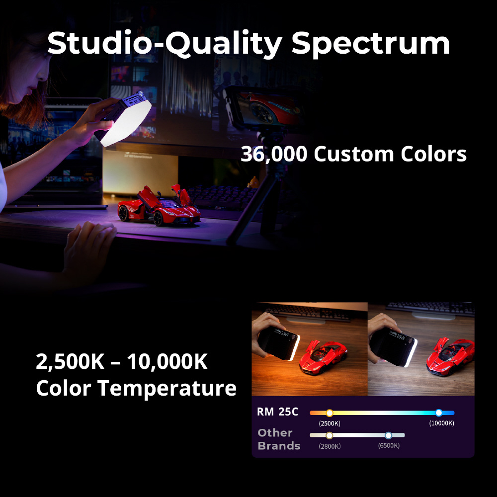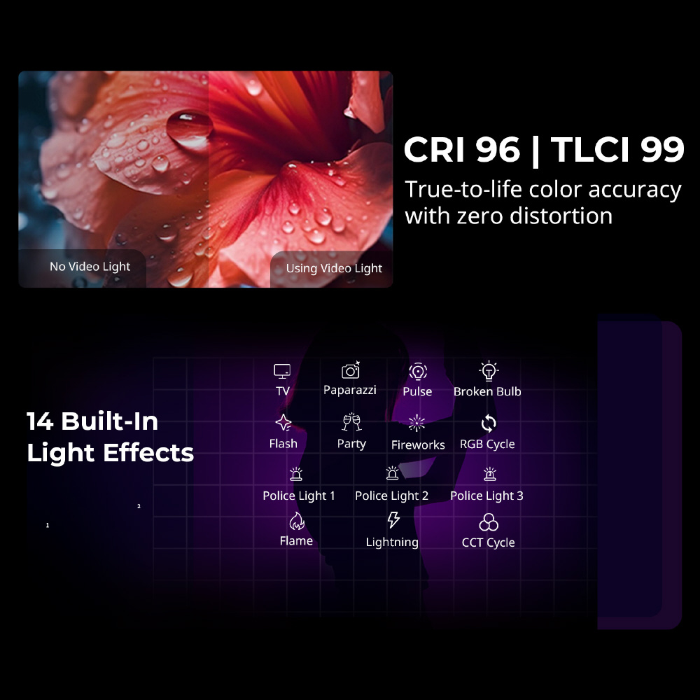 ・ 多彩なRGB+CCT照明: CRI 96、TLCI 99、2500Kから10000Kまでの調整可能なバイカラー温度、36000色以上のカラーバリエーション、14種類の照明効果を内蔵。