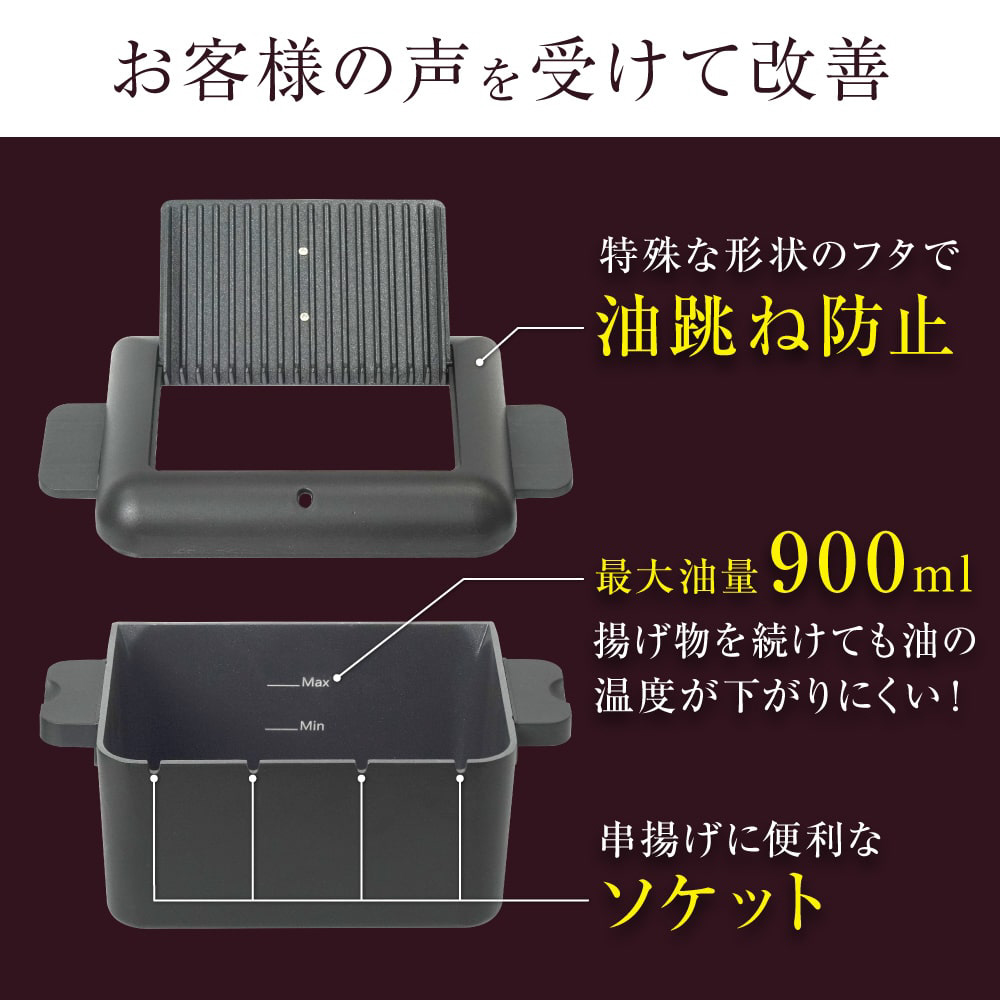 「カラリ」の手軽さはそのままに、油跳ねを防いだり油切りスペースにもなる特殊形状のフタや、 串揚げに便利なソケットなど新機能を追加。