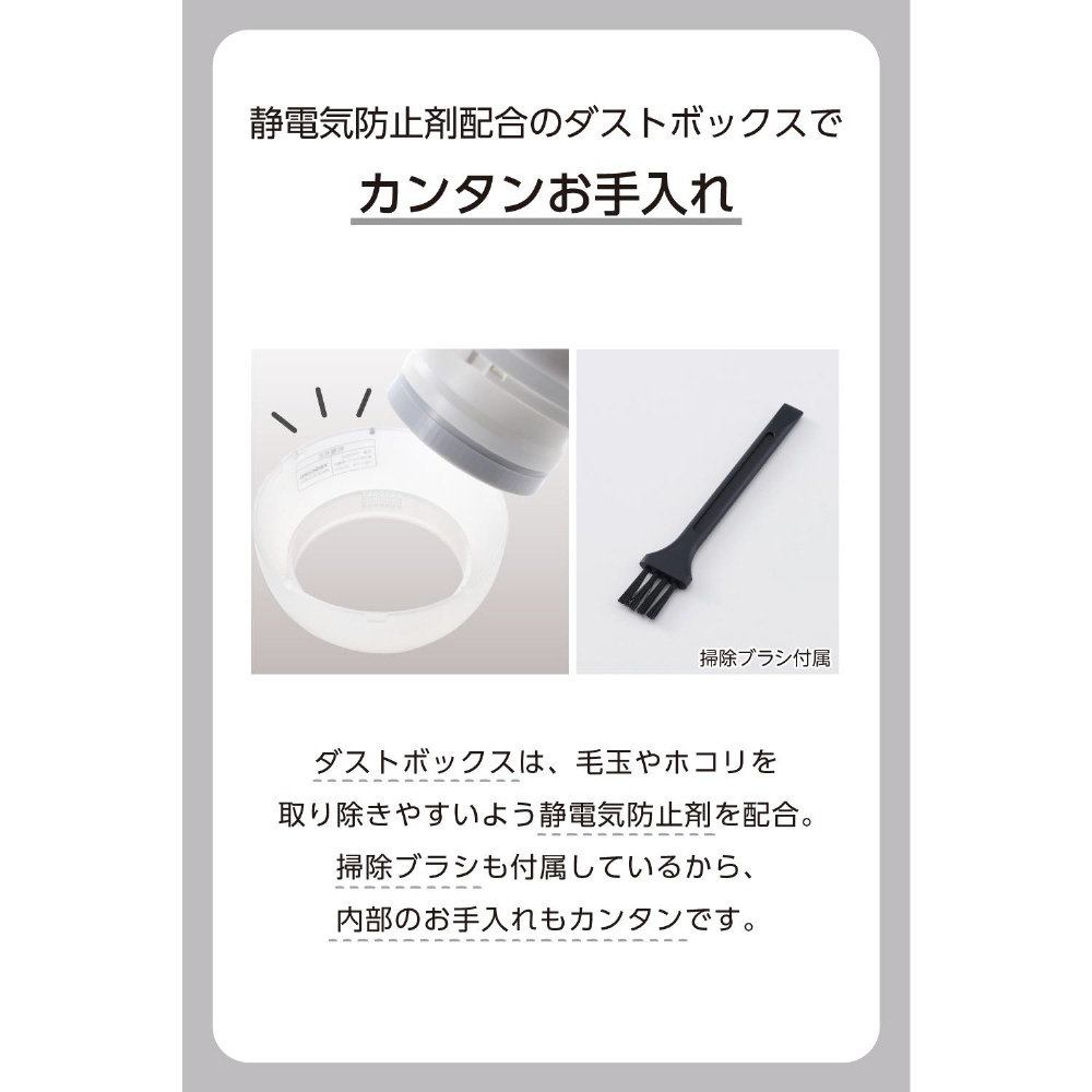 ダストボックスは、毛玉やホコリを取り除きやすいよう静電気防止剤を配合しています。掃除ブラシも付属しているから、内部のお手入れもカンタンです。