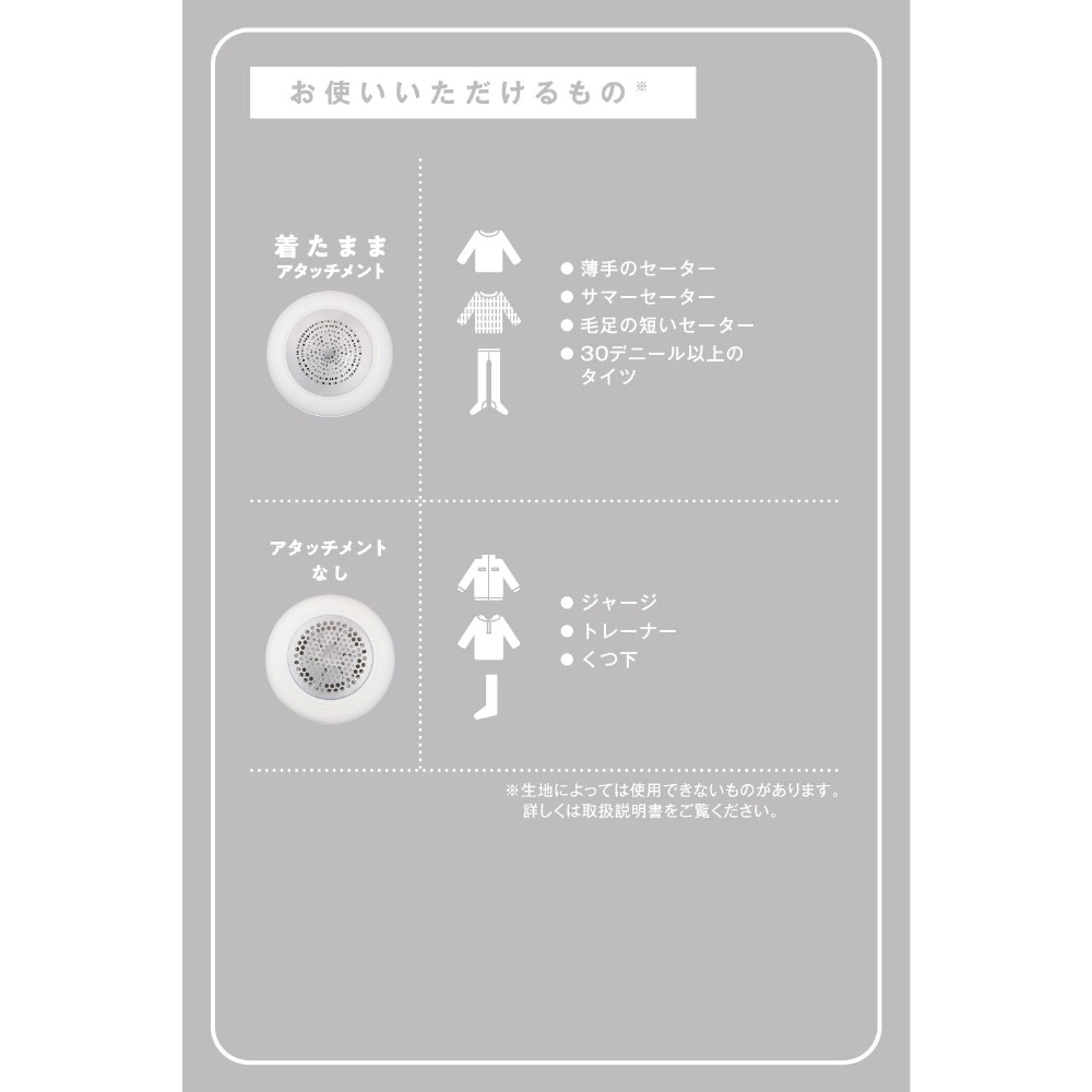 気付いたときに服を着たまま毛玉を取れる、着たままアタッチメントを付属しています。薄手・毛足の短いセーター、30デニール以上のタイツなど、その場でお手入れできます。