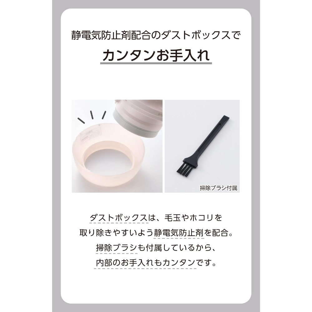 ダストボックスは、毛玉やホコリを取り除きやすいよう静電気防止剤を配合しています。掃除ブラシも付属しているから、内部のお手入れもカンタンです。