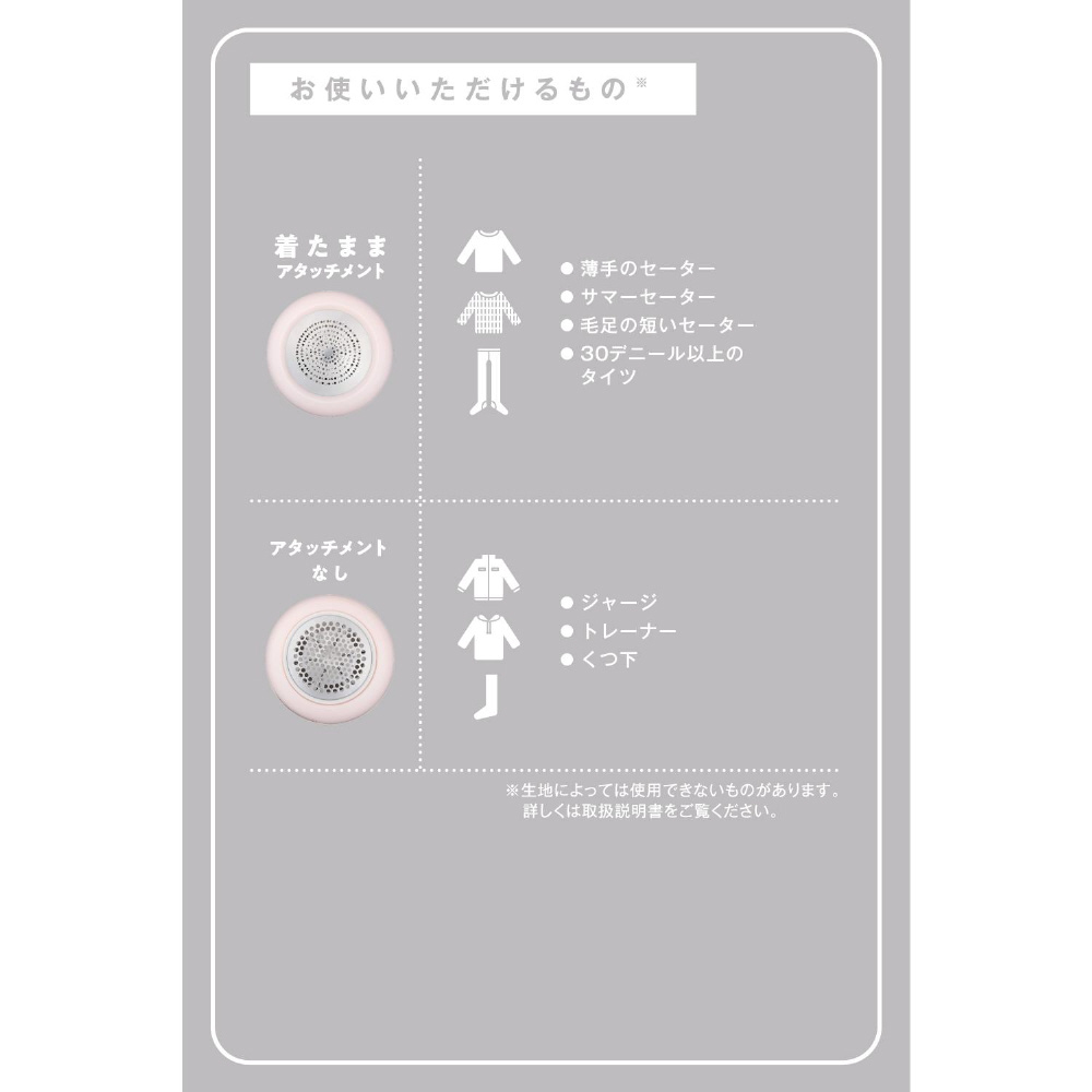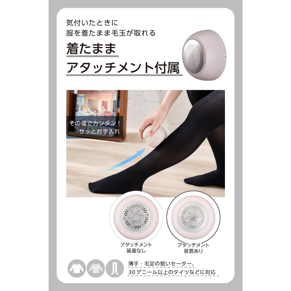 気付いたときに服を着たまま毛玉を取れる、着たままアタッチメントを付属しています。薄手・毛足の短いセーター、30デニール以上のタイツなど、その場でお手入れできます。