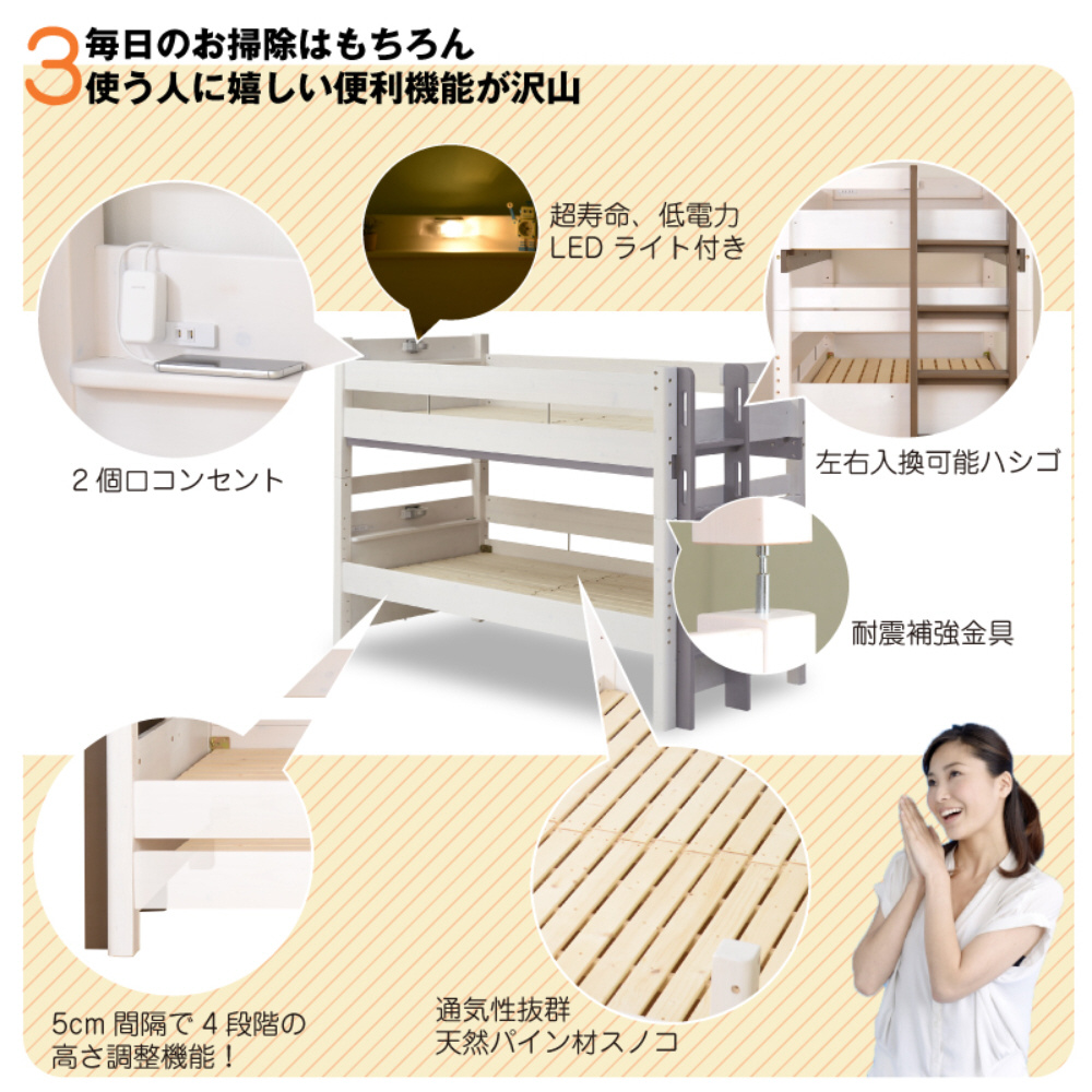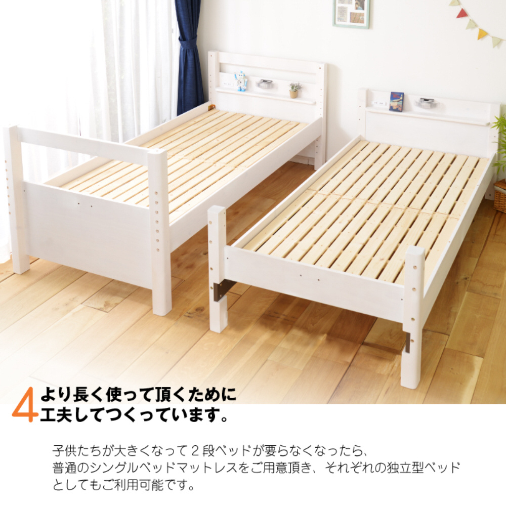 ベッドは上段と下段を連結せずにシングルベッドとしても使用可能。