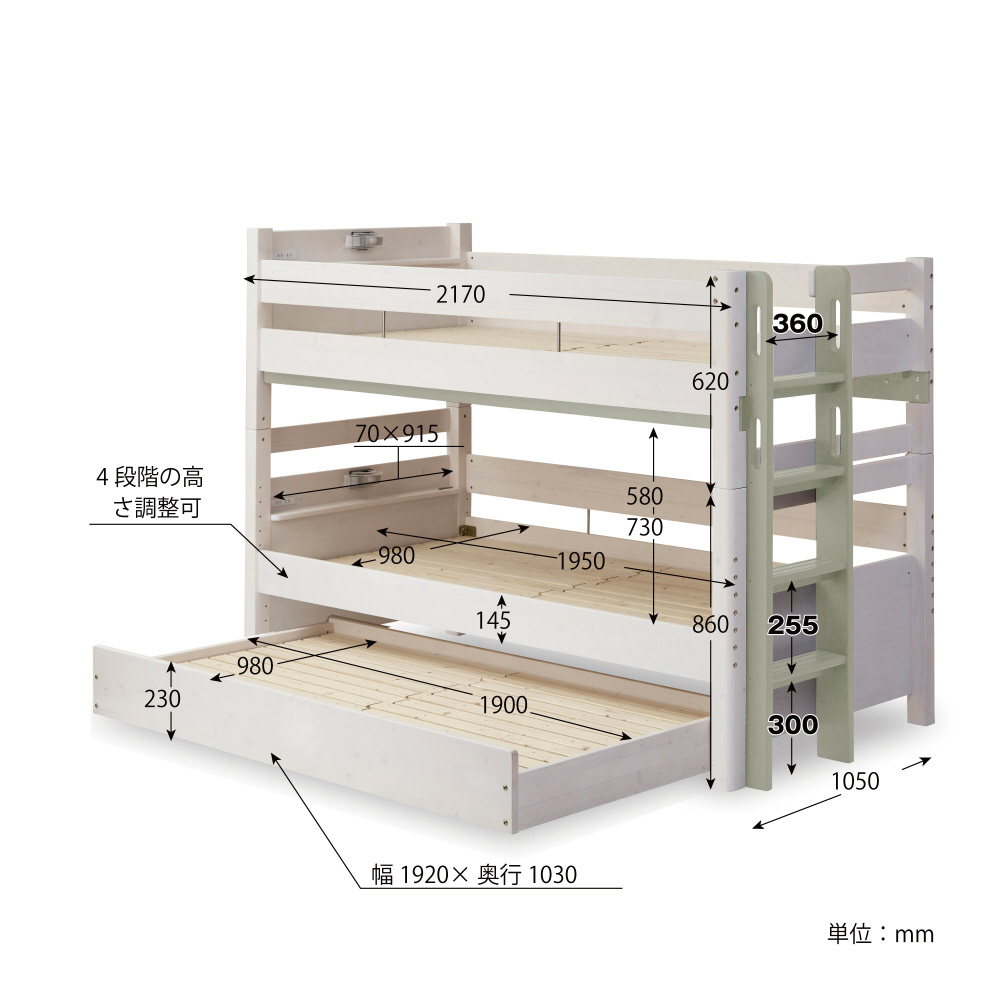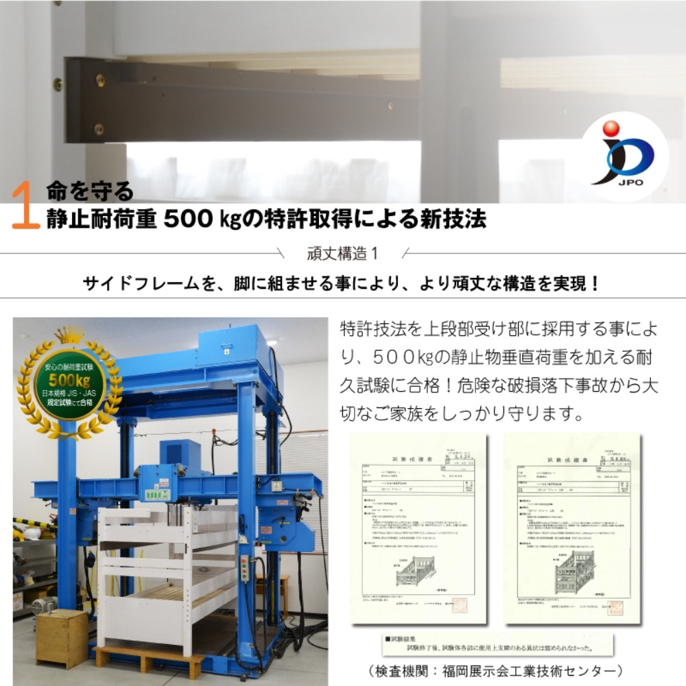 静止荷重は500kgの特許を取得した安心安全設計の3段ベッドフレーム