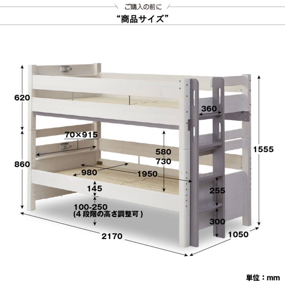 静止荷重は500kgの特許を取得した安心安全設計の2段ベッドフレーム