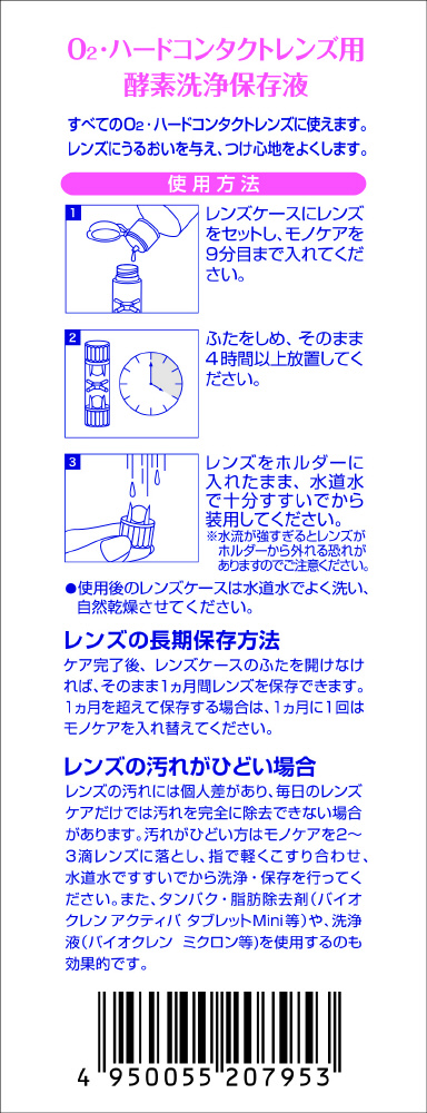 「バイオクレン モノケア モイスト」はタンパク質分解酵素と界面活性剤のダブル効果でレンズ上の汚れを取り除き、ハードレンズの快適な装用感を保ちます。